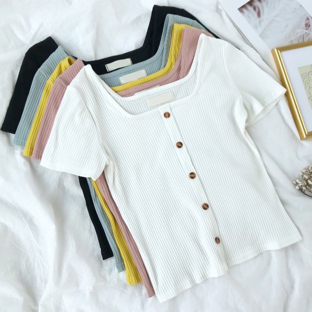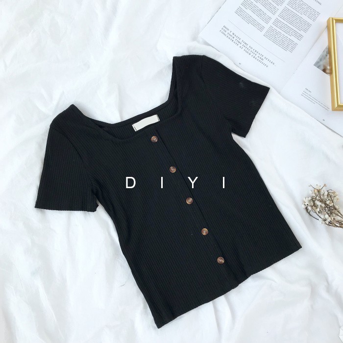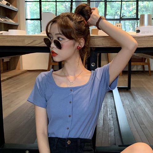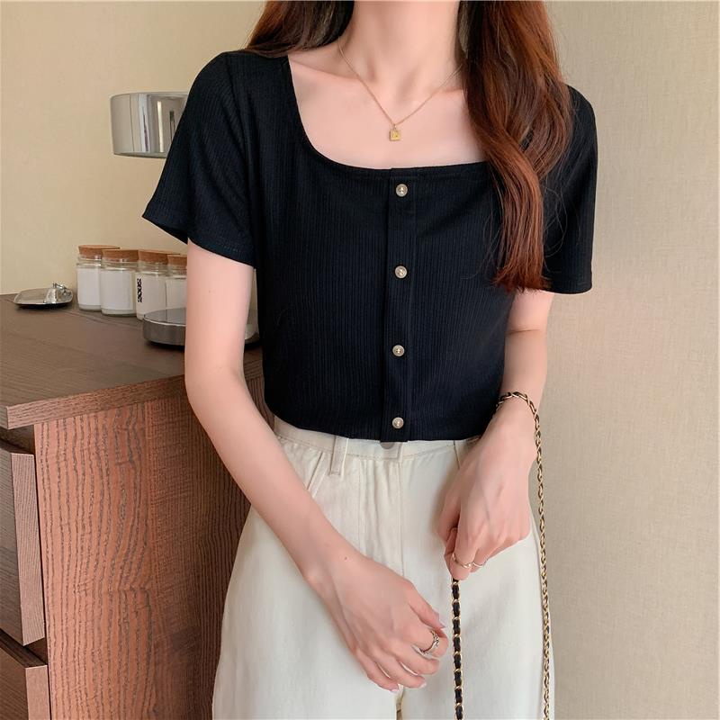 ZUCA”S - 復古港味ins方領單排扣短袖T恤 - TT-1907