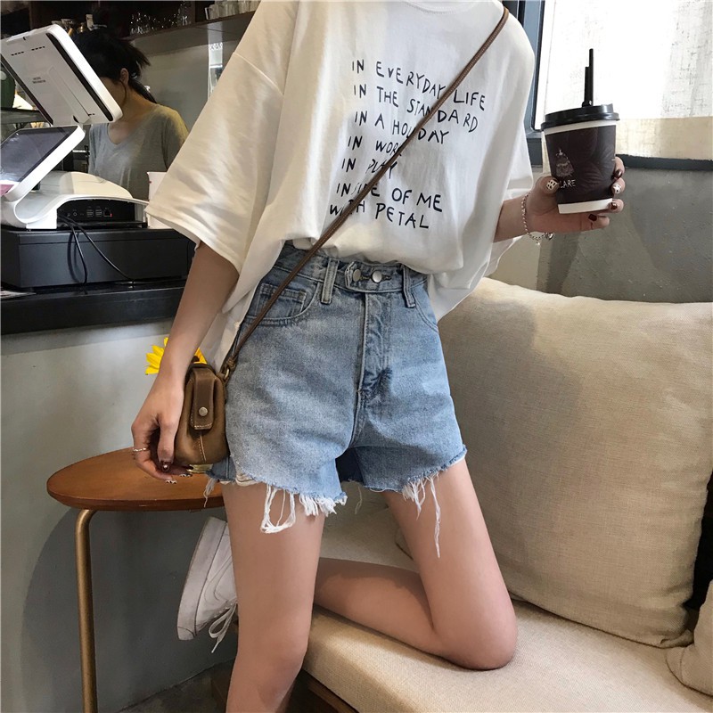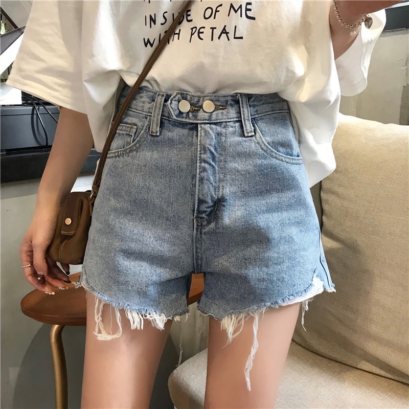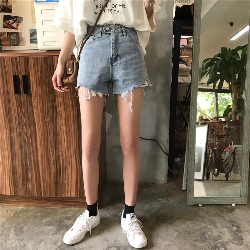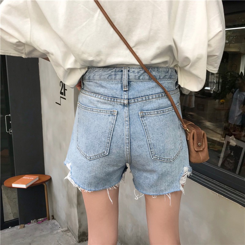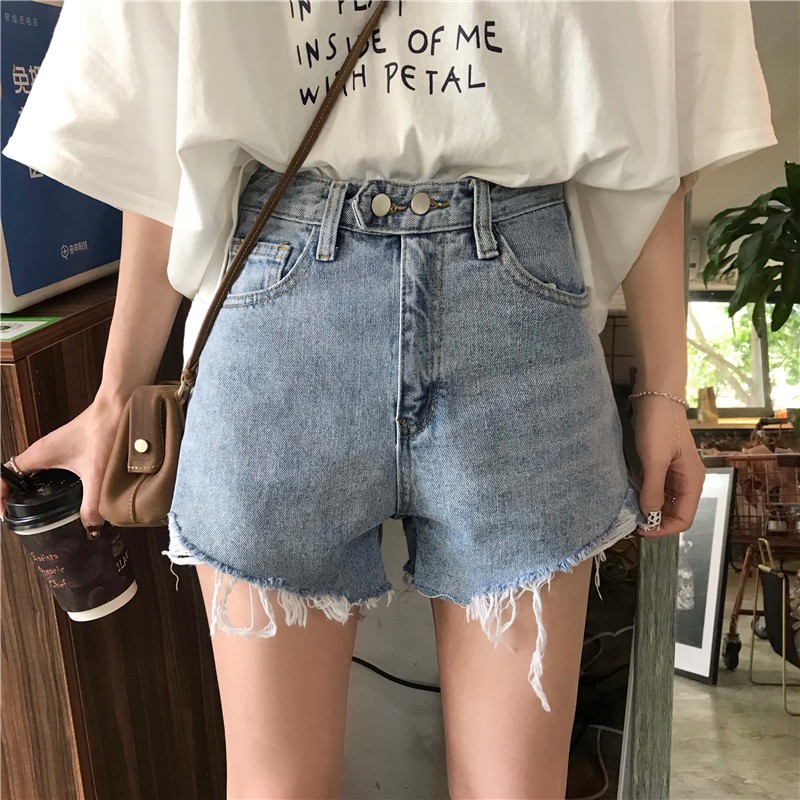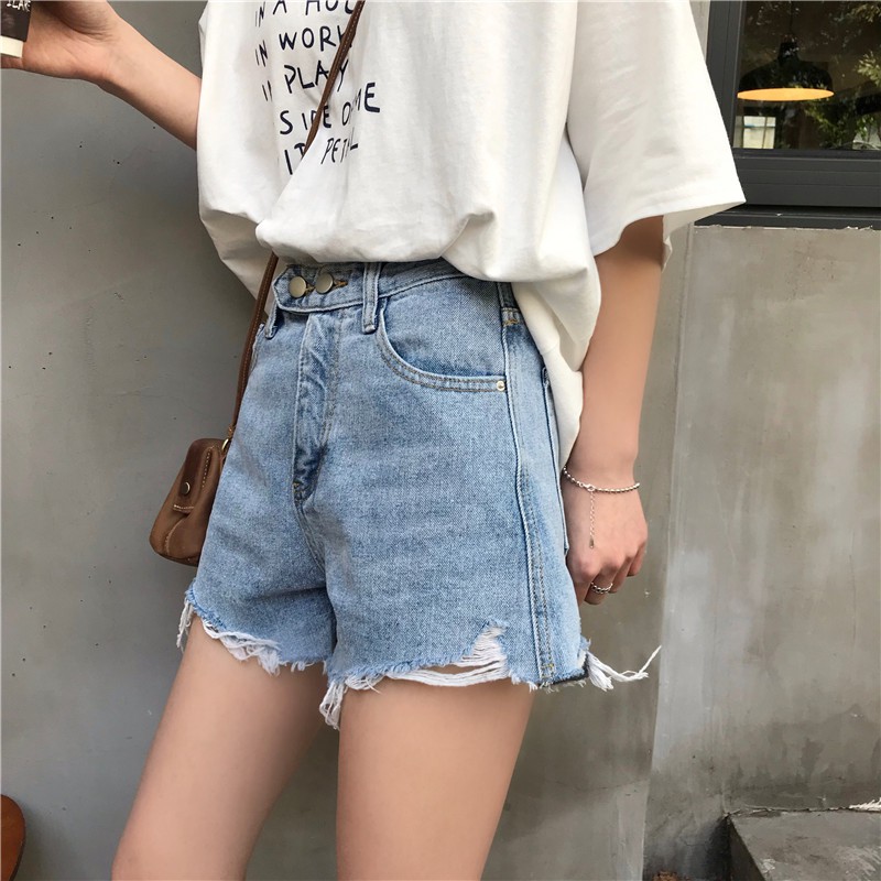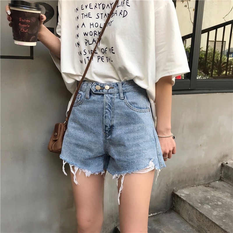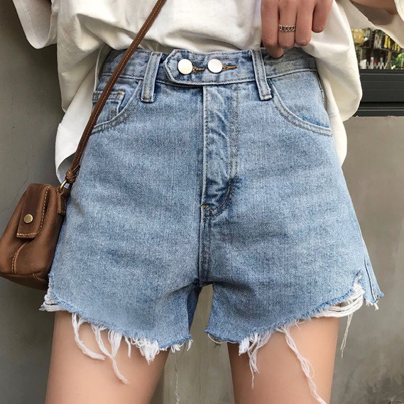 ZUCA”S - (現貨)高腰單排扣破洞毛邊牛仔短褲 - NN-1009
