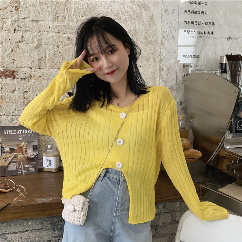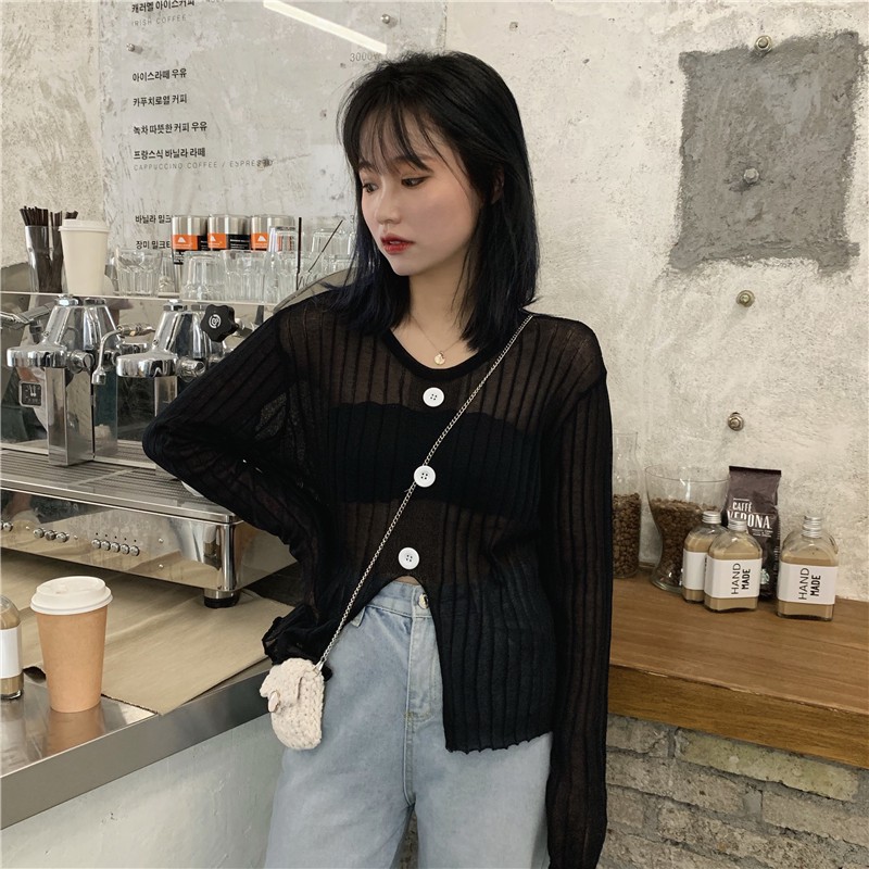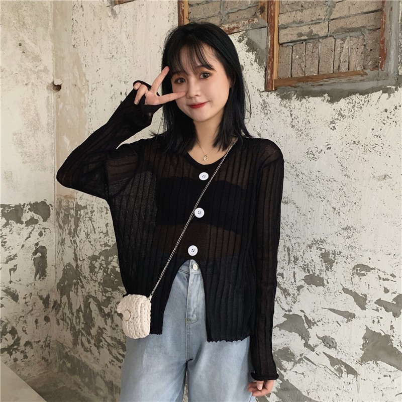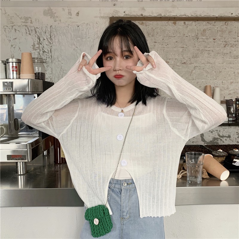 ZUCA”S - 開叉紐扣圓領防曬長袖針織衫上衣 - T-7260