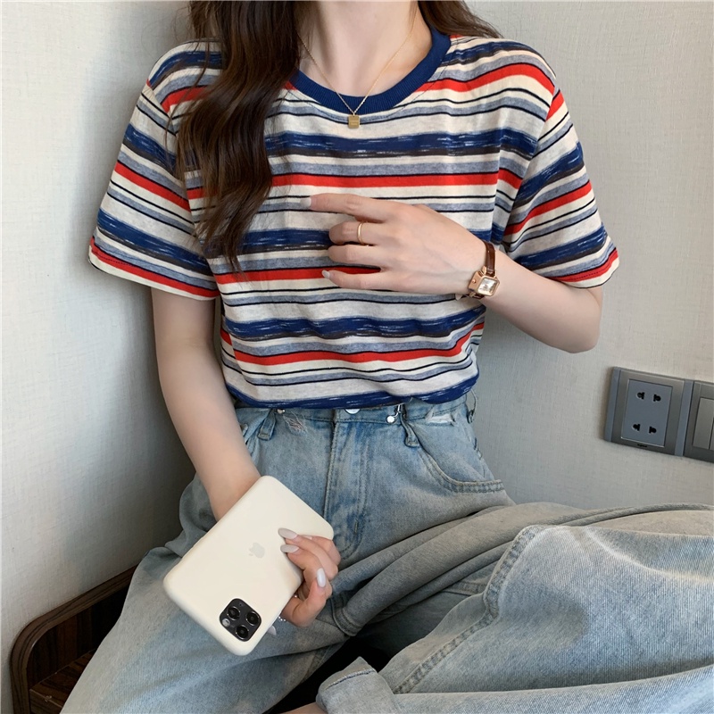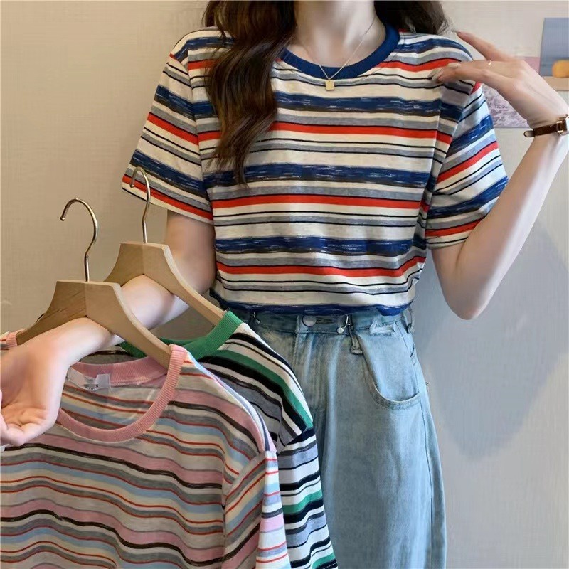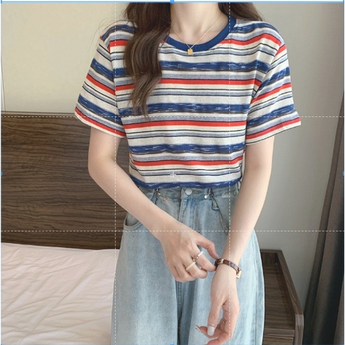 ZUCA”S~(現貨出清)配色條紋卷邊短袖T恤 - (T-488)