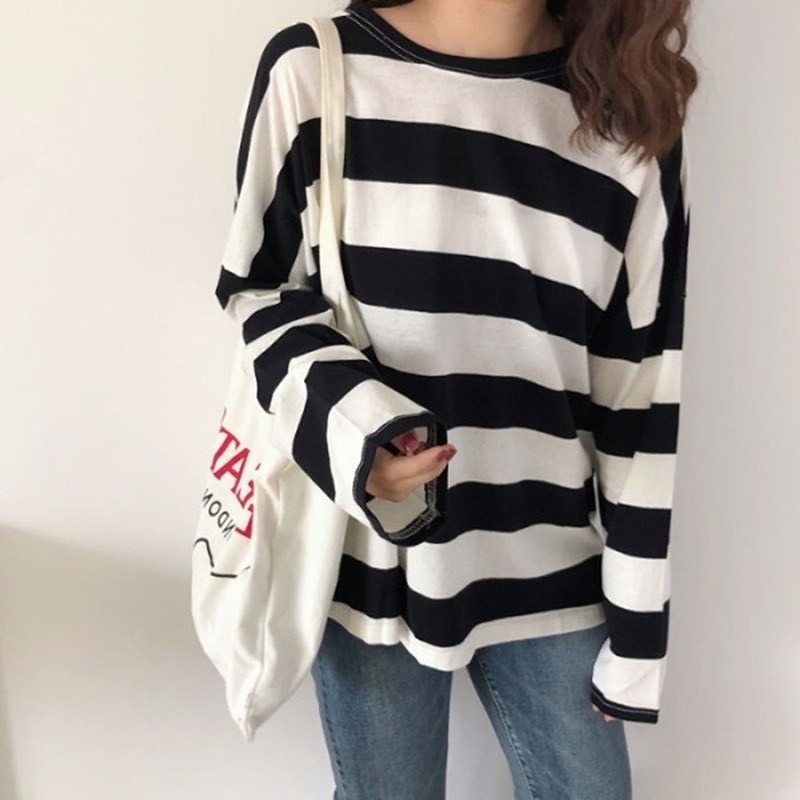 ZUCA”S - 韓版秋冬韓版寬鬆條紋T 女裝 衣服 寬鬆上衣 配色長T【N-6729】