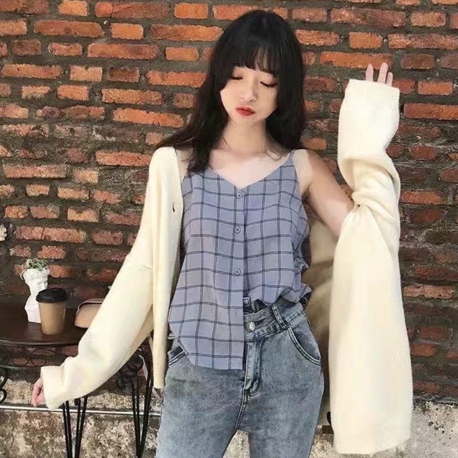 ZUCA”S - 吊帶背心 V領背心 寬鬆 韓版小清新百搭無袖格子吊帶背心 - DD-856
