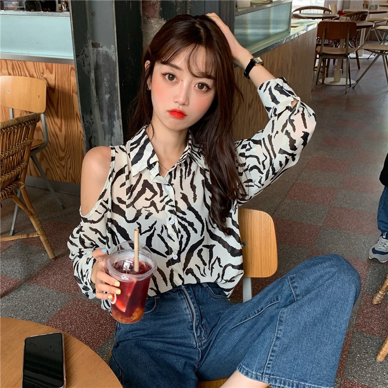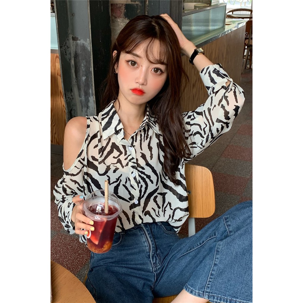 ZUCA”S - 露肩斑馬紋雪紡短袖襯衫 - N-1119