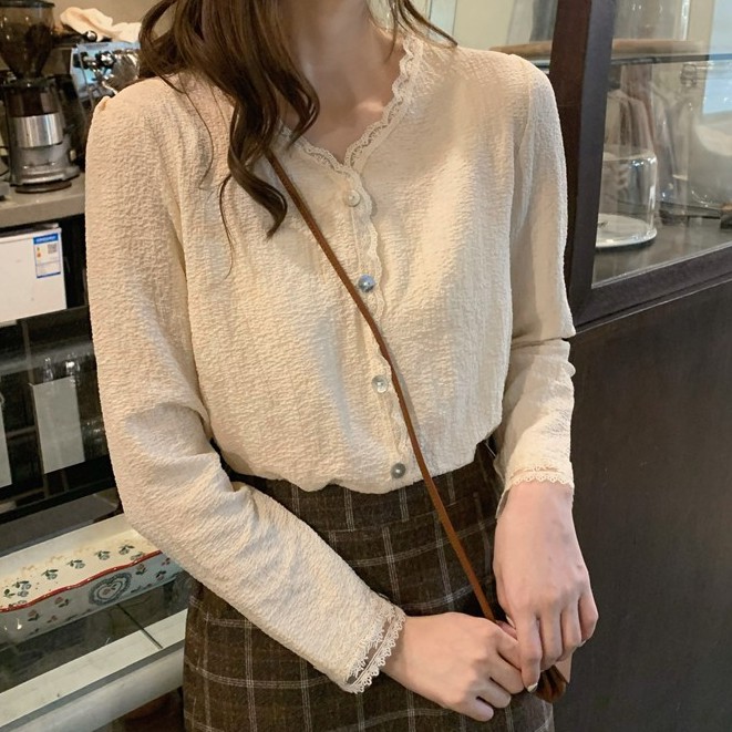 ZUCAS - 氣質襯衫蕾絲花邊長袖上衣- GU-6622