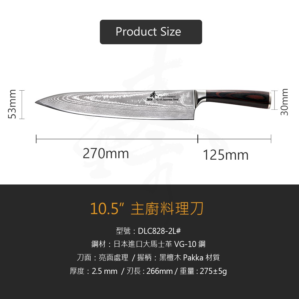 《Zhen 臻》270mm (VG10)鋼 牛刀 (主廚料理刀 廚師刀) - 黑檀木柄 ~ 日本進口67層大馬士革鋼