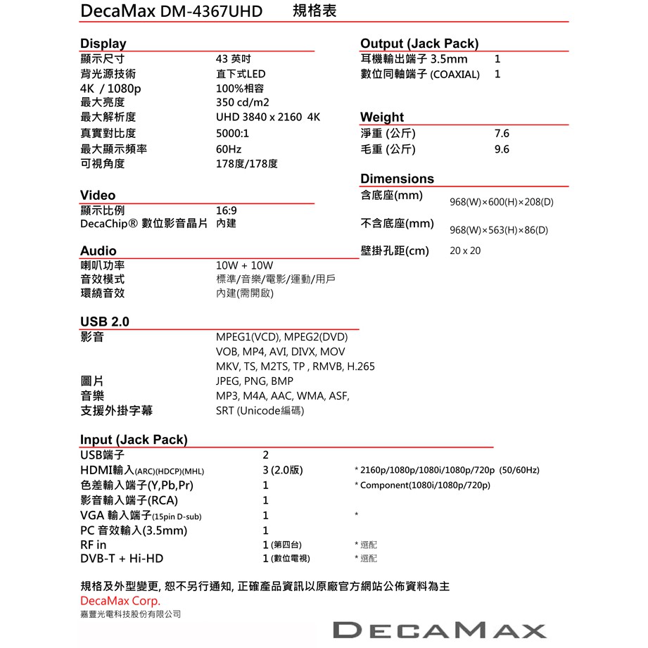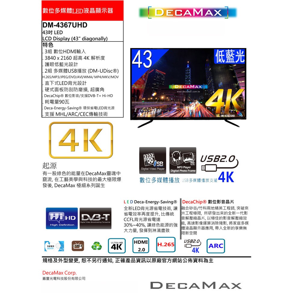 (免運費)DECAMAX 43吋 UHD 4K 液晶電視 (DM-4367UHD) HDMI 2.0 LED TV電視機
