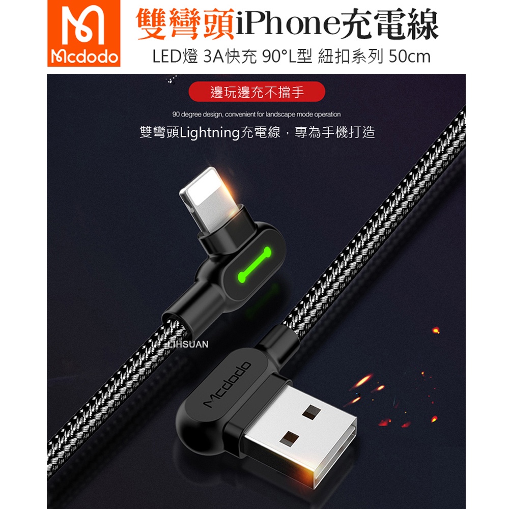Mcdodo iPhone/Lightning充電線傳輸線編織 L型 彎頭 LED 快充 紐扣系列 50cm 麥多多
