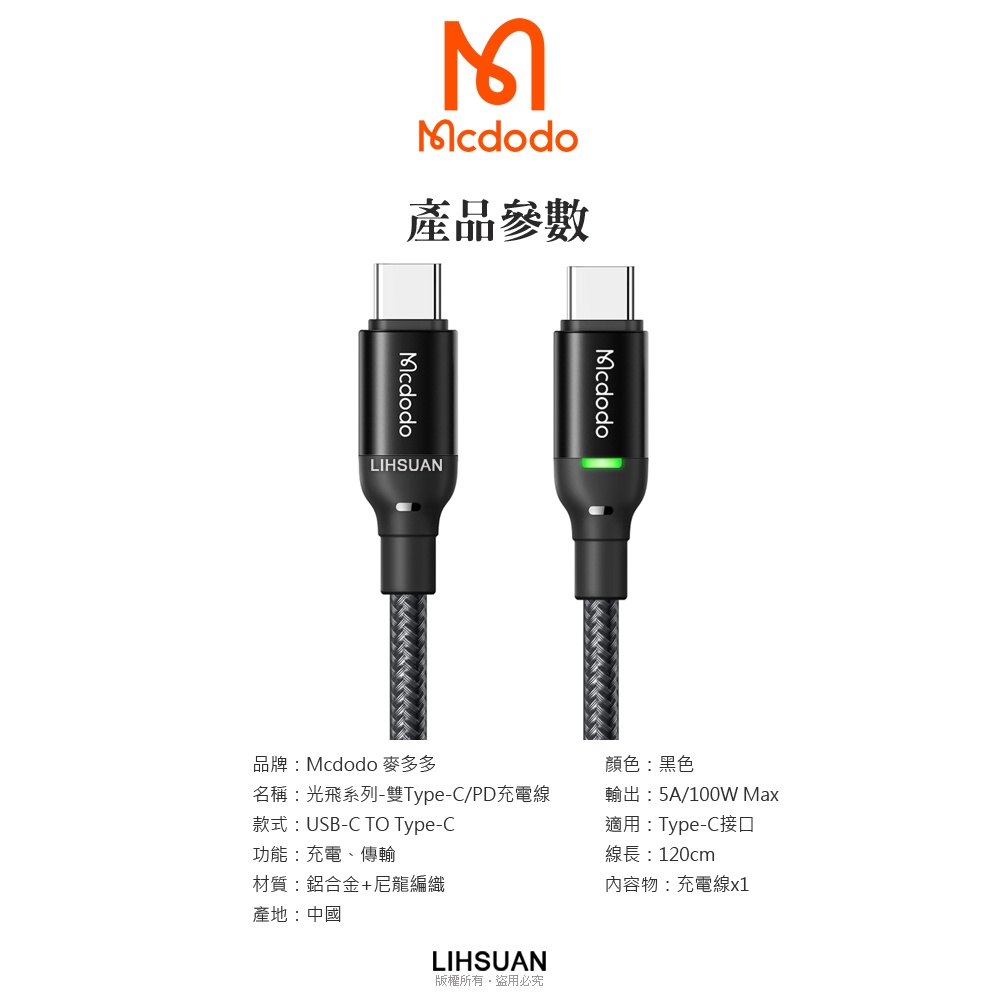 Mcdodo 雙Type-C/PD充電線傳輸線閃充線快充線 100W LED 光飛 1.2M 麥多多