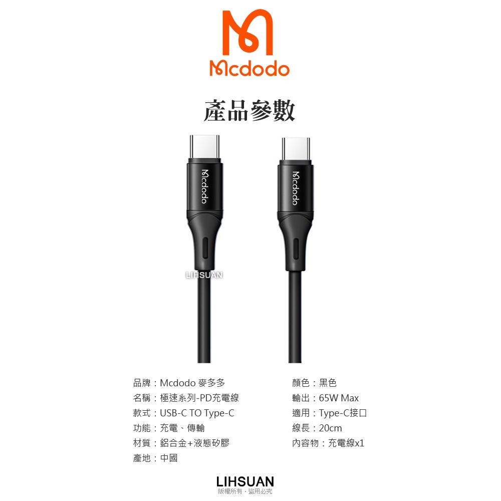 Mcdodo 雙Type-C/PD充電線傳輸線閃充線快充線 液態矽膠 極速 20cm 麥多多