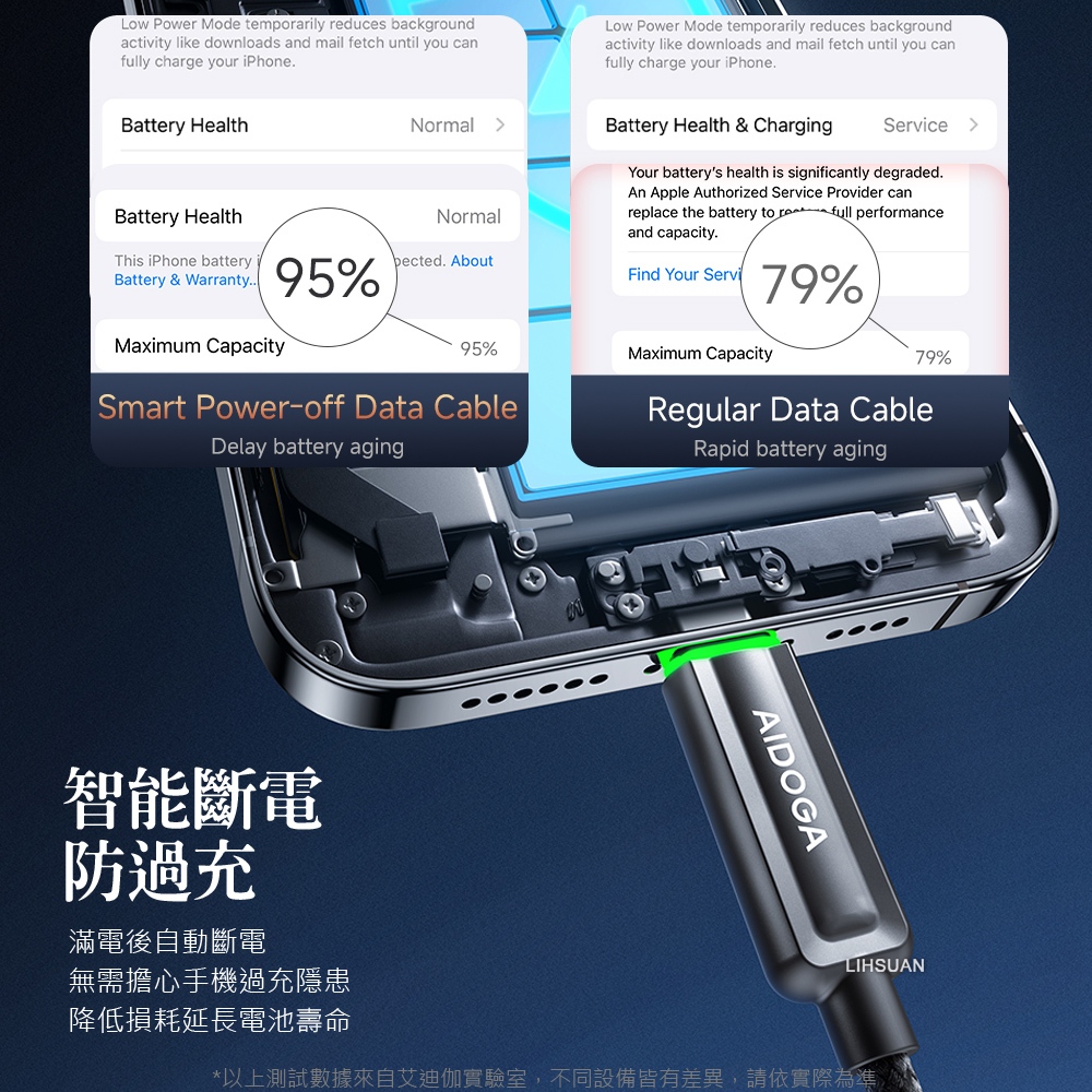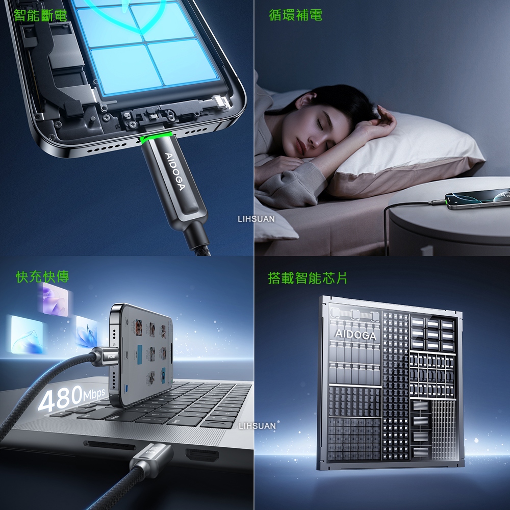 AIDOGA PD Type-C TO Lightning 智能斷電充電線傳輸線 LED 呼吸燈 補電 閃極 1.2M