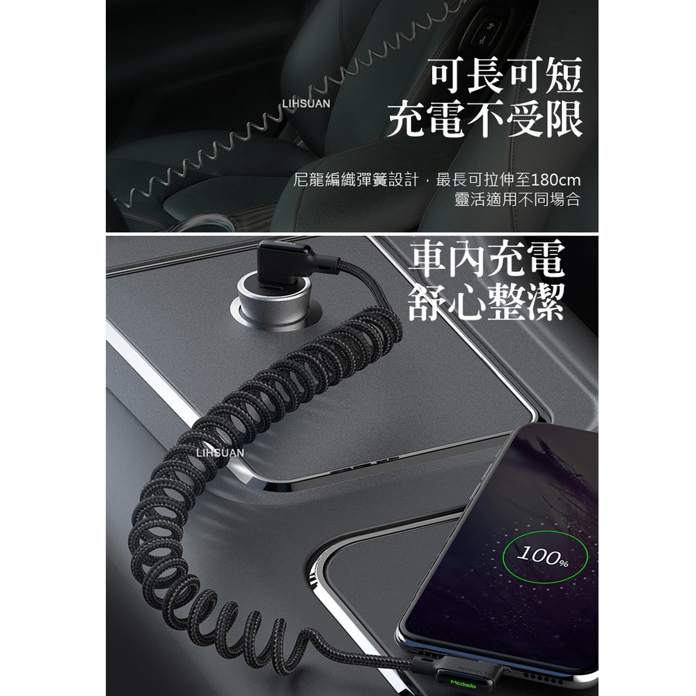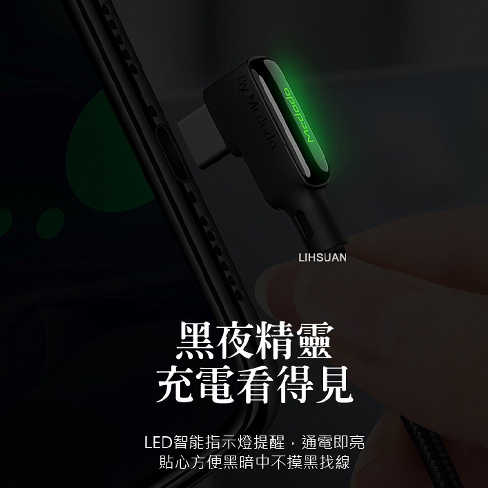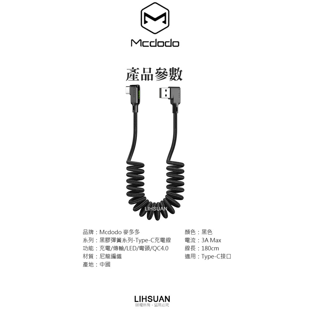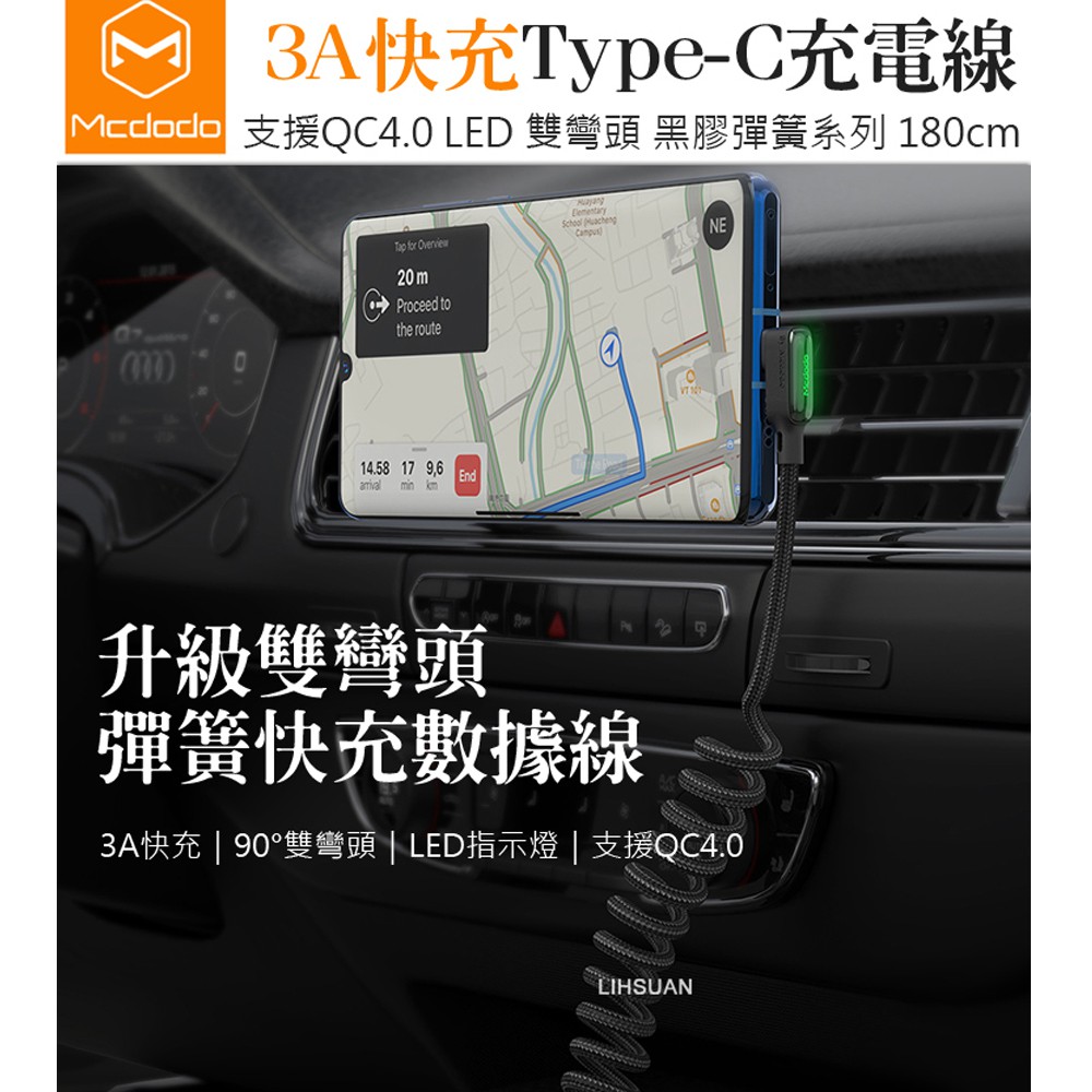 Mcdodo Type-C充電線閃充線傳輸線 彎頭 LED QC4.0 黑膠彈簧系列 180cm 麥多多