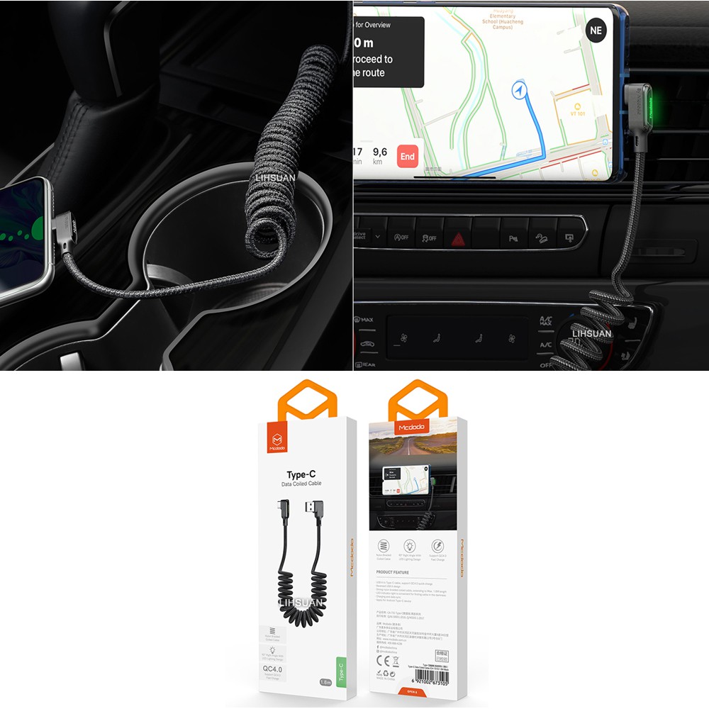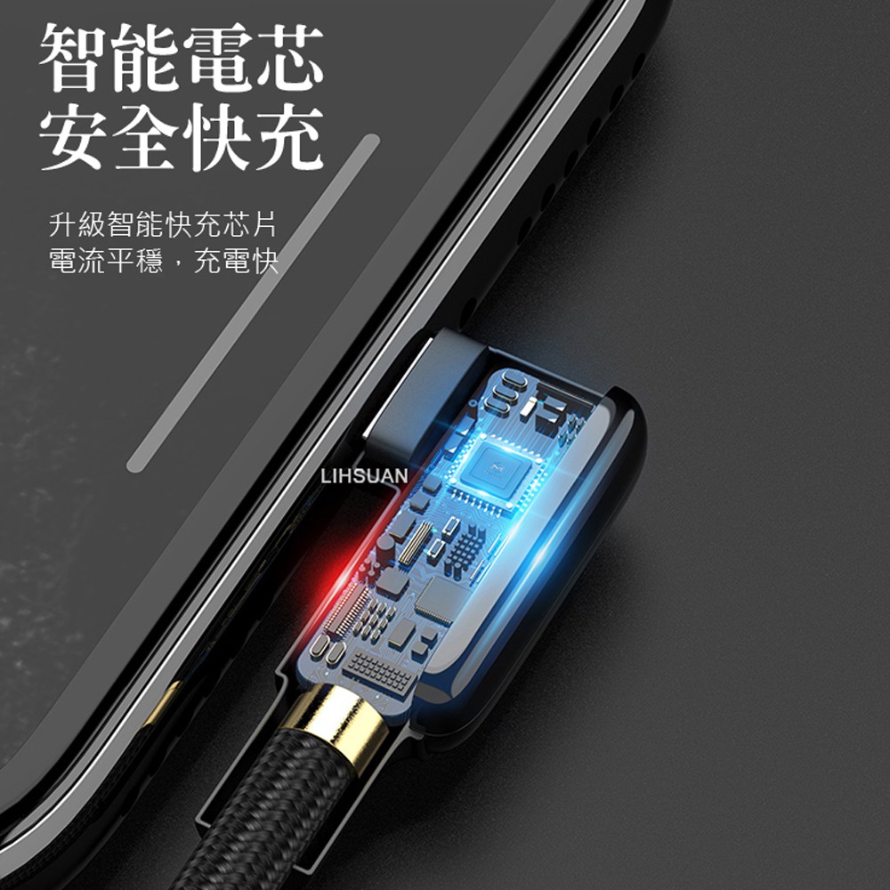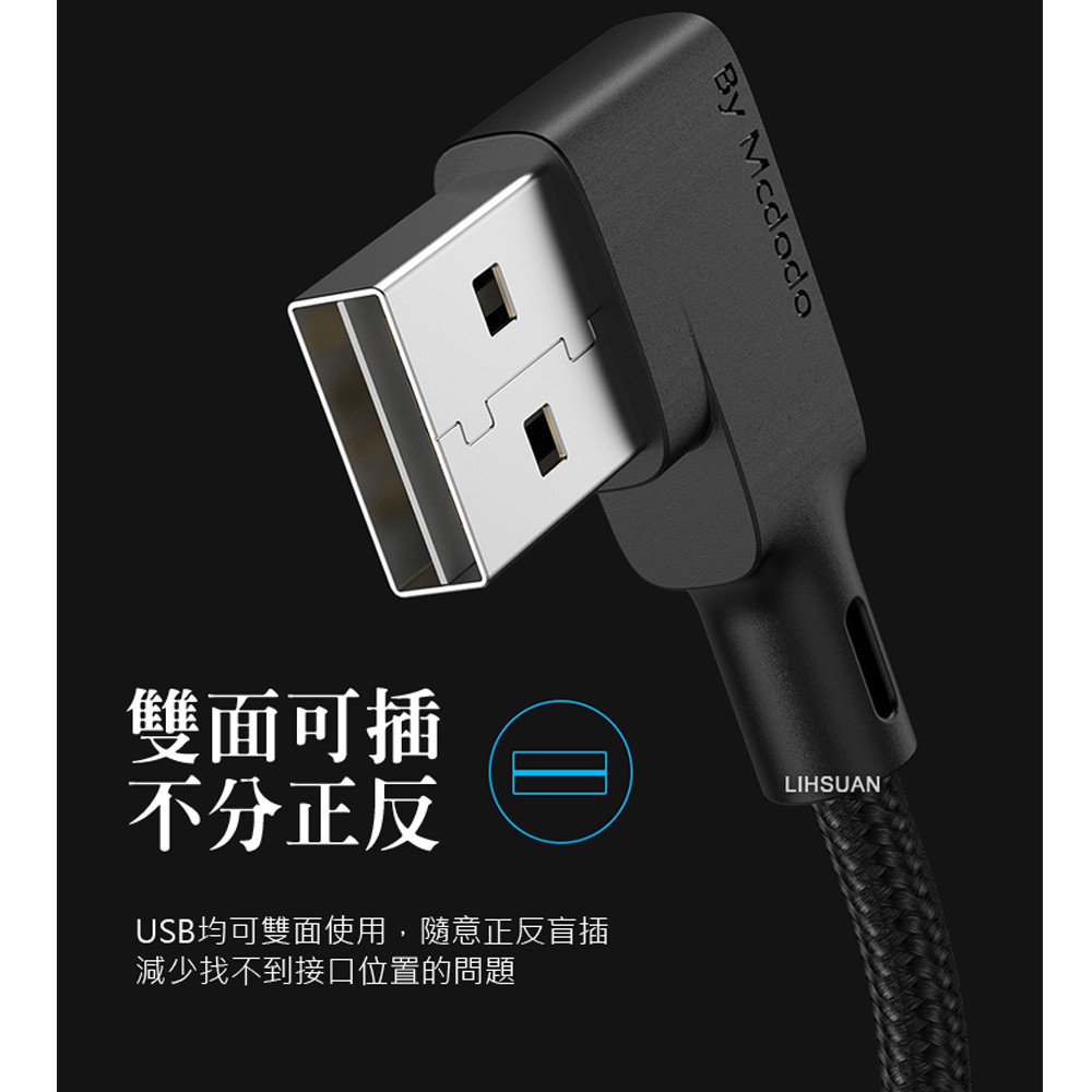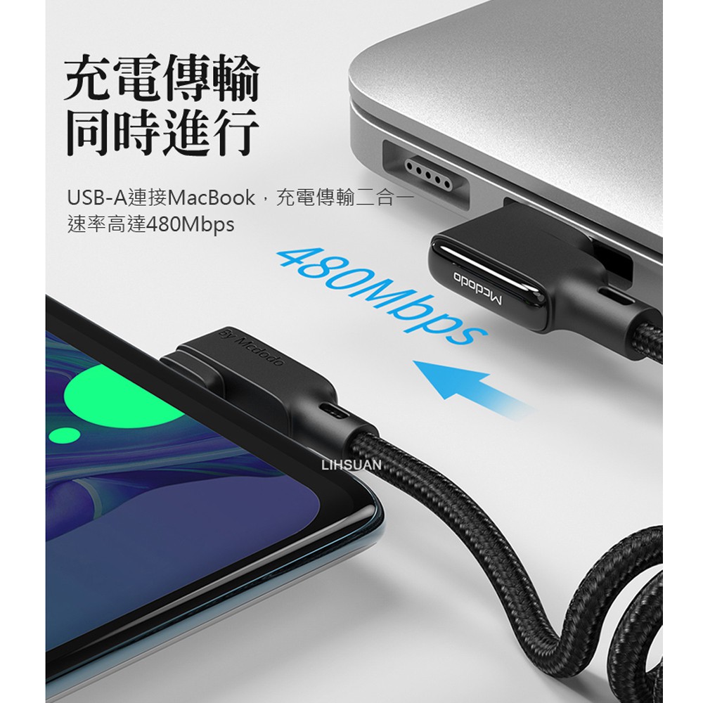Mcdodo Type-C充電線閃充線傳輸線 彎頭 LED QC4.0 黑膠彈簧系列 180cm 麥多多