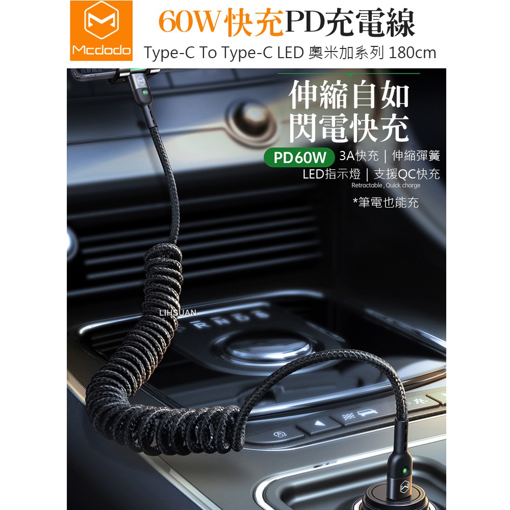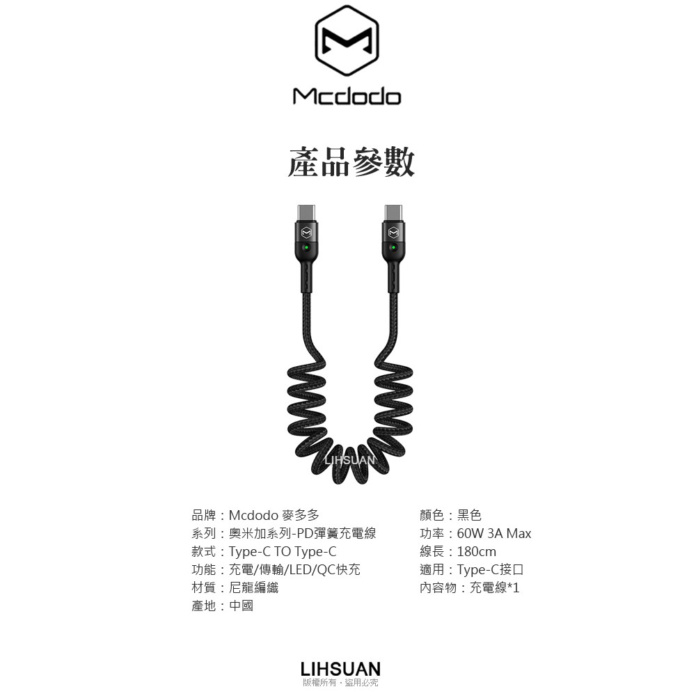 Mcdodo 雙Type-C/PD充電線傳輸線快充線閃充線 指示燈 彈簧 QC 奧米加系列 180cm 麥多多