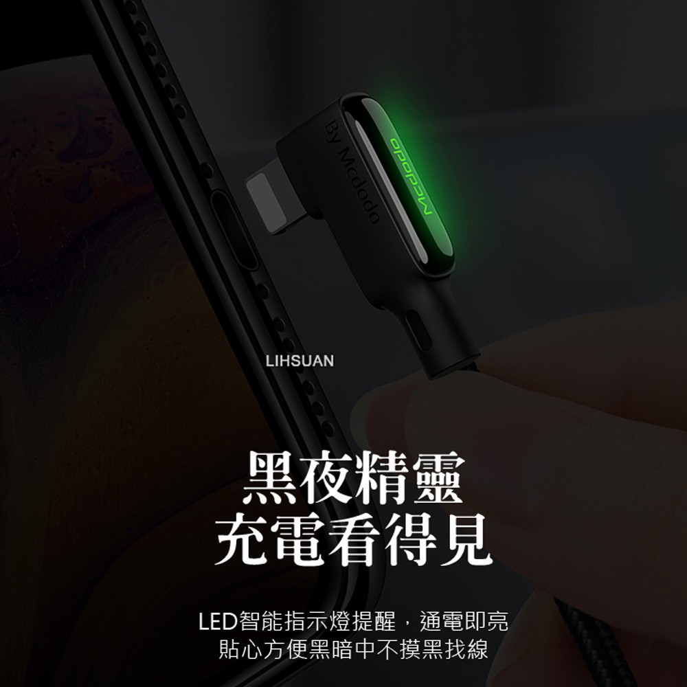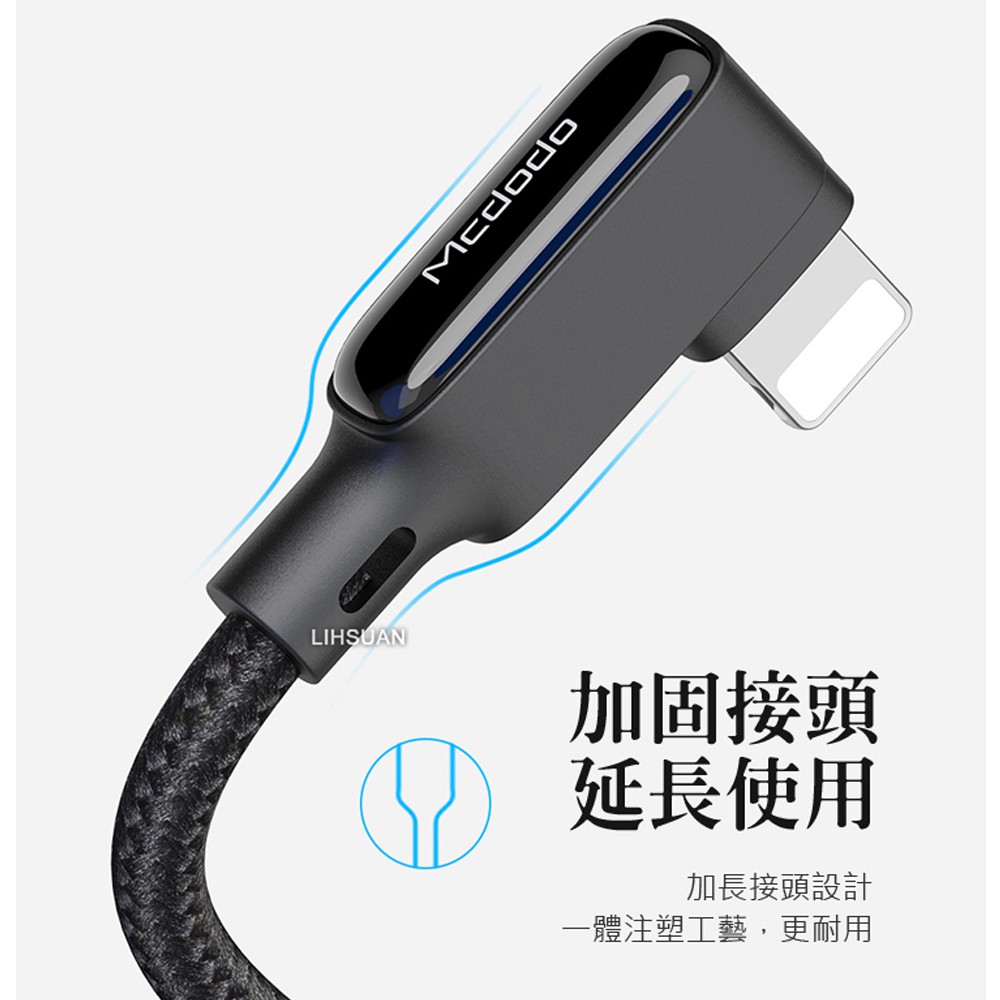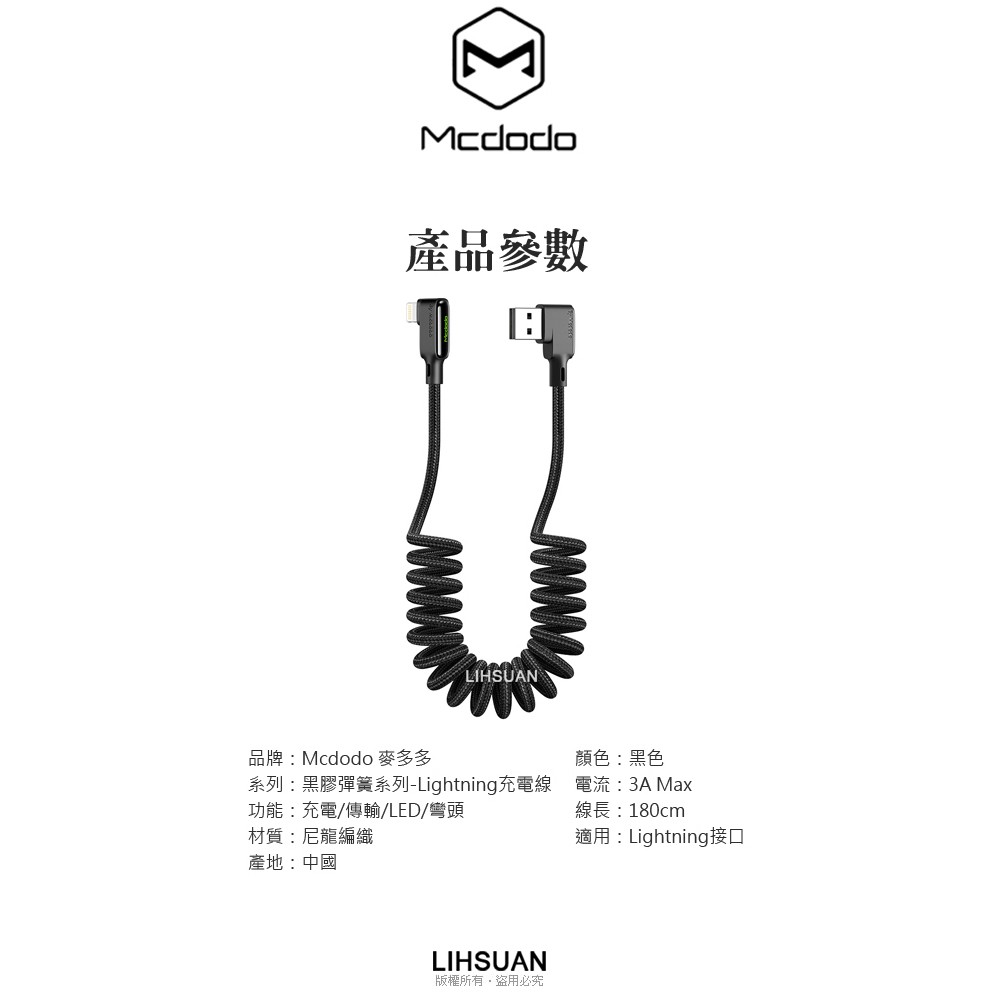 Mcdodo iPhone/Lightning充電線傳輸線 彎頭 LED 3A快充 黑膠彈簧系列 180cm 麥多多