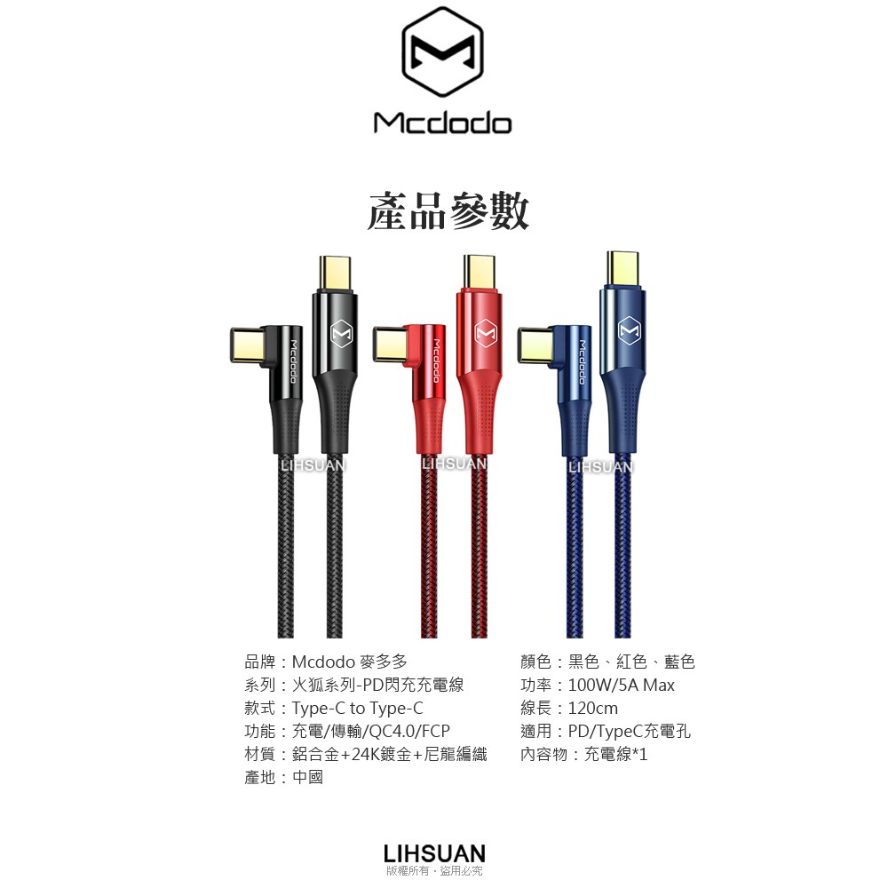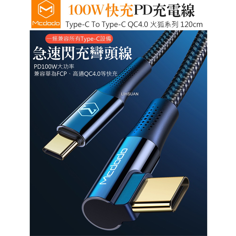 Mcdodo 雙Type-C/PD充電線傳輸線快充線閃充線 彎頭手遊 QC4.0 100W 火狐系列 1.2M/2M