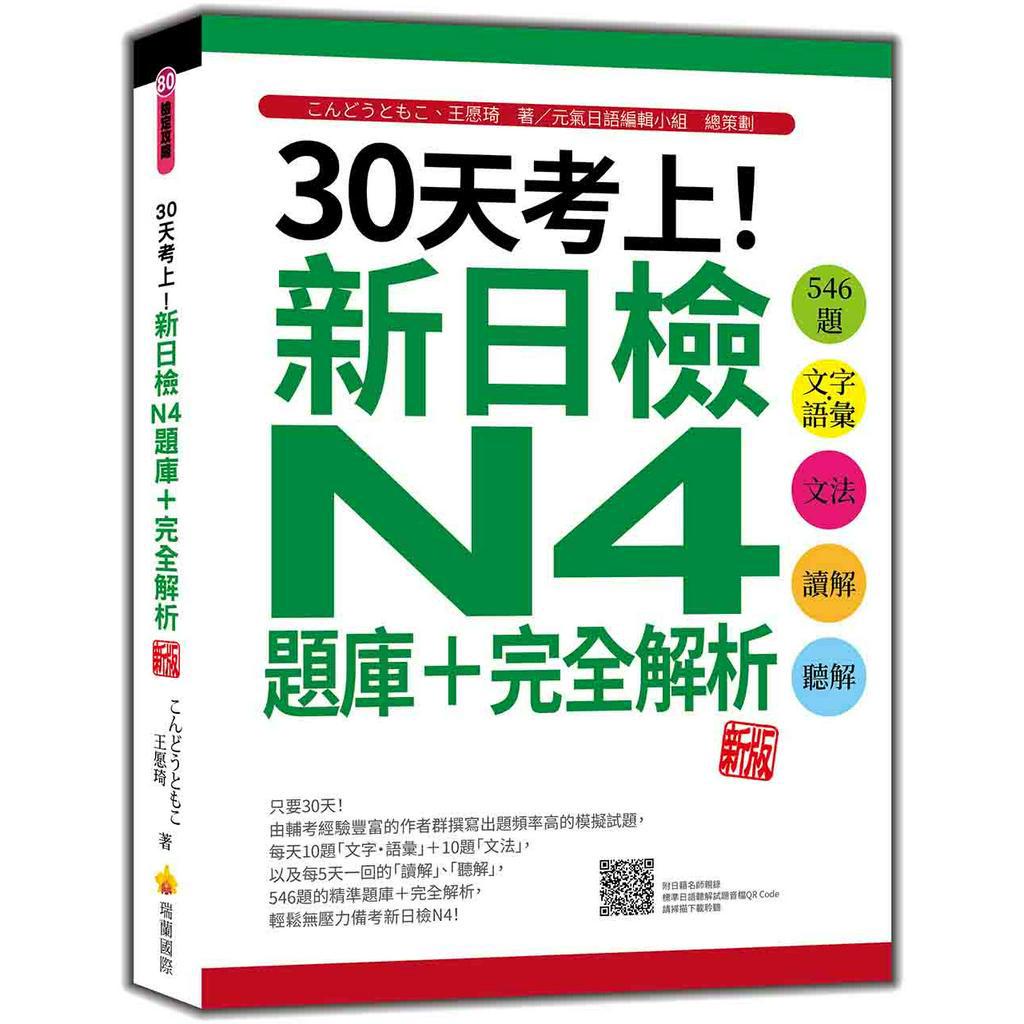 瑞蘭國際出版|30天考上!新日檢N4題庫+完全解析 新版:546題文字‧語彙、文法、讀解、聽解(隨書附日籍名師親錄標準日語聽解試題音檔QR Code)