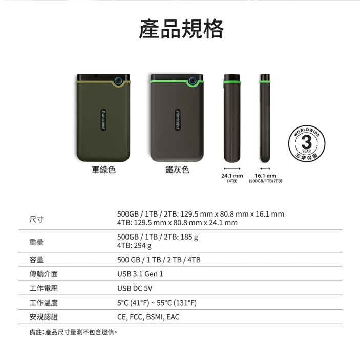 創見 2.5吋 M3 外接硬碟 1TB 2TB 4TB 行動硬碟 軍規抗震2T 4T隨身硬碟 適用Win/Mac贈轉接頭