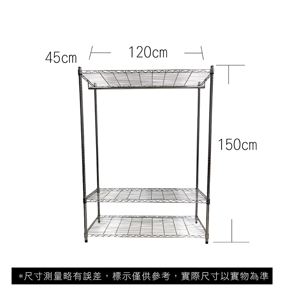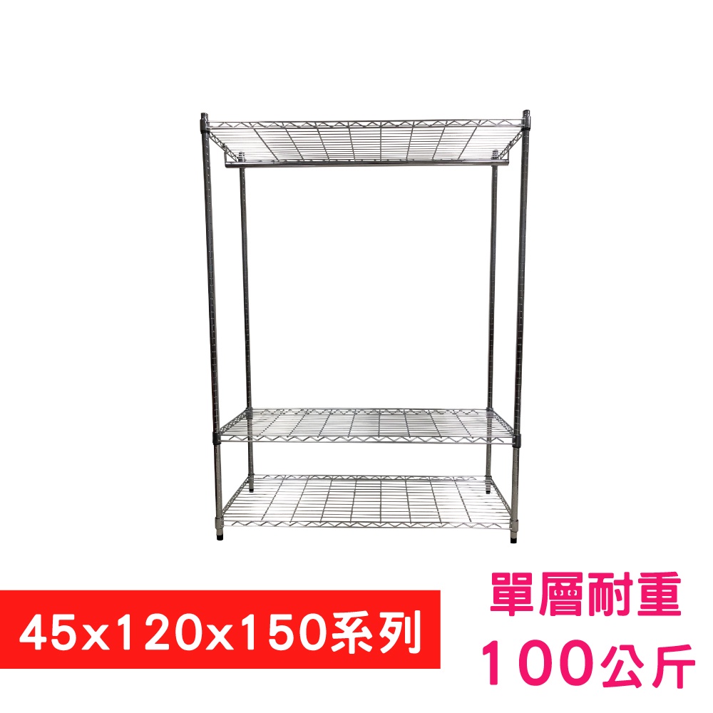 【我塑我形】120x45x150cm 鐵力士三層收納架-含衣桿 台灣製 單層耐重100kg 鍍鉻鐵架 層架