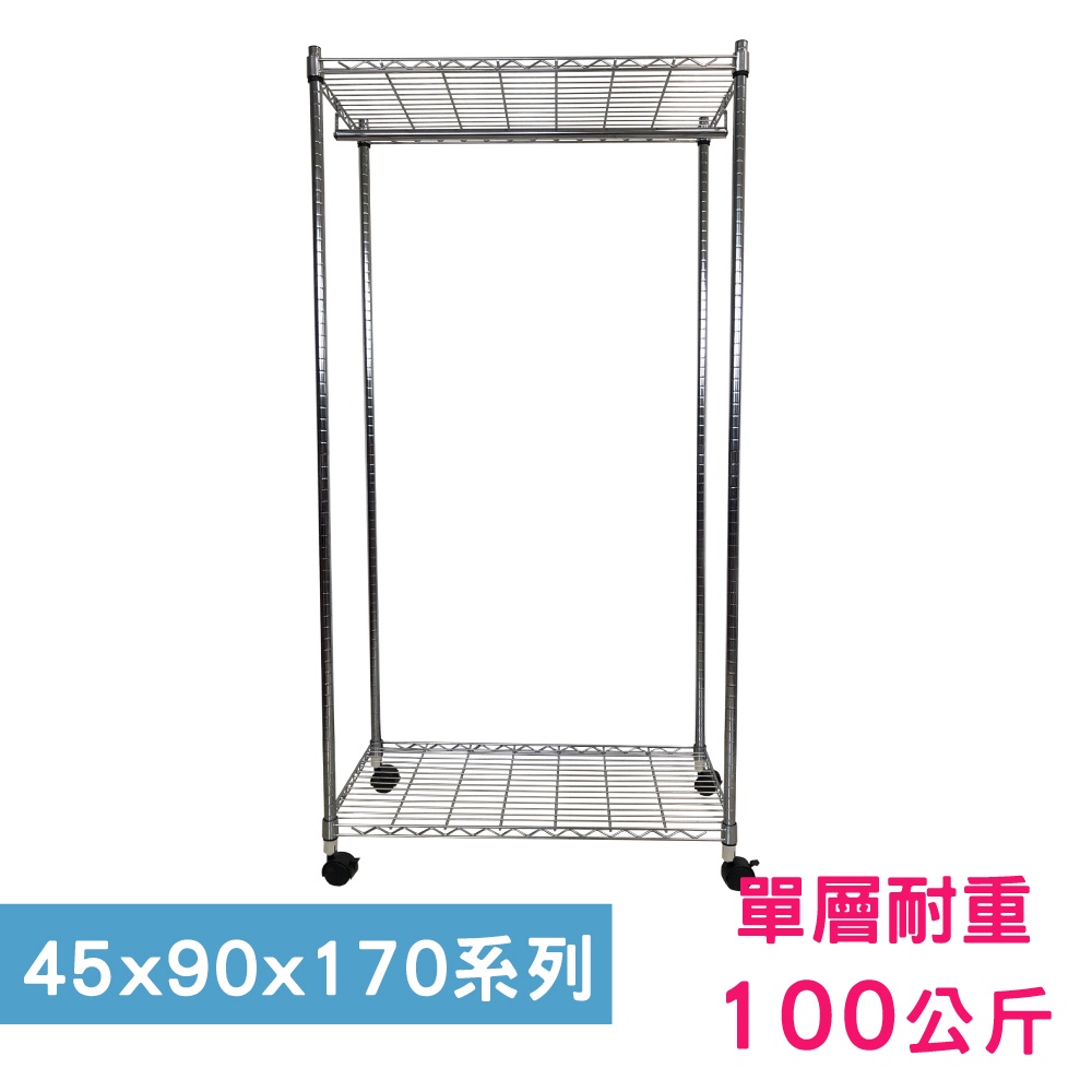 【我塑我形】90x45x170cm 鐵力士二層收納架+輪-含衣桿 台灣製 單層耐重100kg 移動式鍍鉻層架