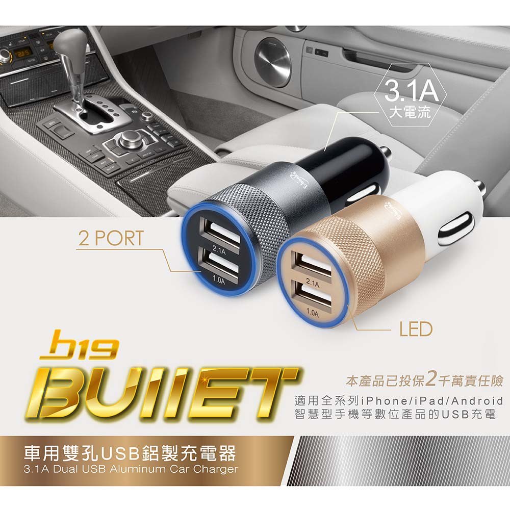 E-books B19 車用3.1A 雙孔USB鋁製充電器-金