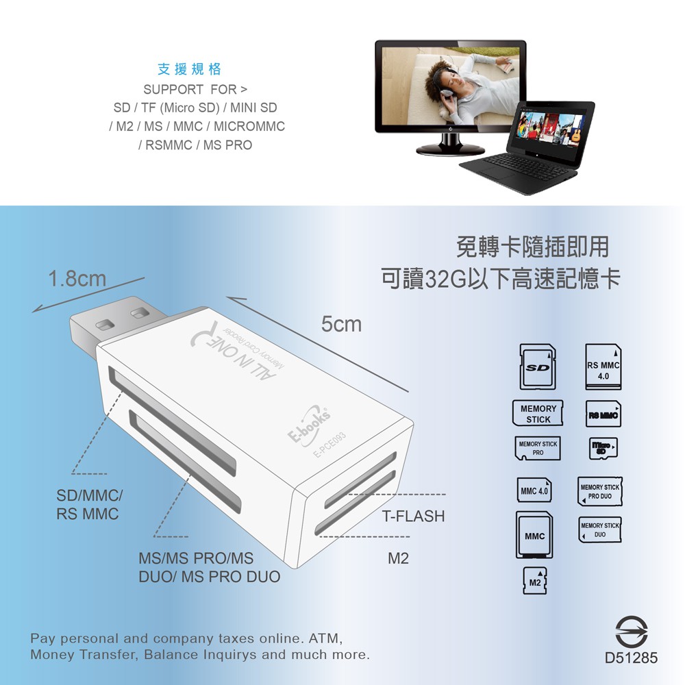E-books T24 鋁製40合1四槽讀卡機 (藍)