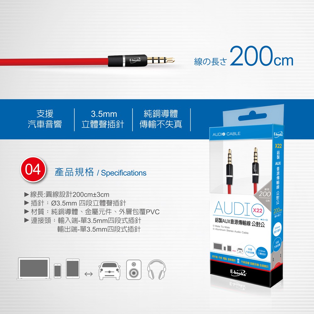 E-books X22鋁製AUX音源傳輸線公對公3.5mm-200cm
