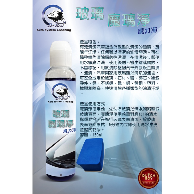 【達特貝爾Dr.bear】熊牌 玻璃油漬 油膜去除劑組(油膜去除劑150ml+擦拭板)