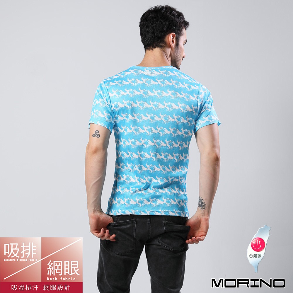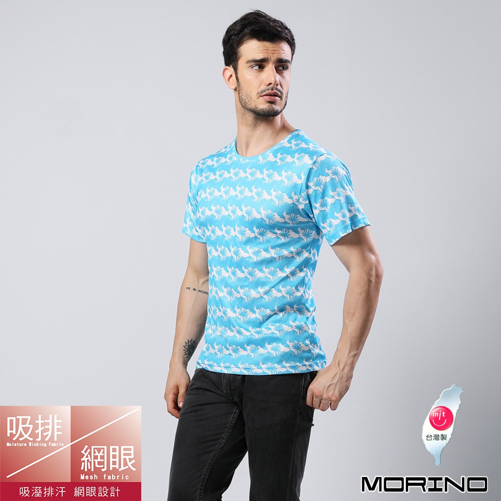 【MORINO】吸排涼爽叢林網眼圓領衫/T恤_白底藍 MO5214 吸濕排汗 輕鬆穿著 透氣舒適 叢林風情 輕鬆穿著