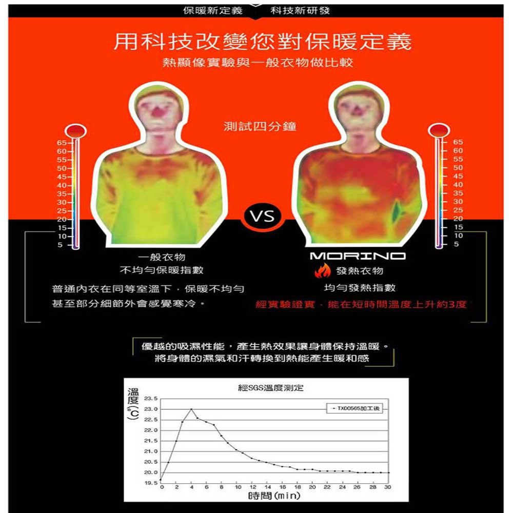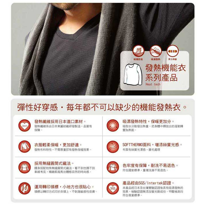 【MORINO】日本素材長袖發熱衣V領衫_黑灰 MO5508 男內搭衣