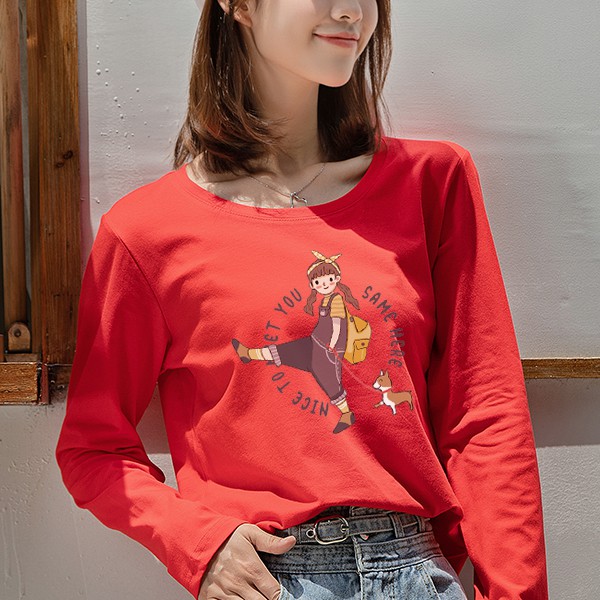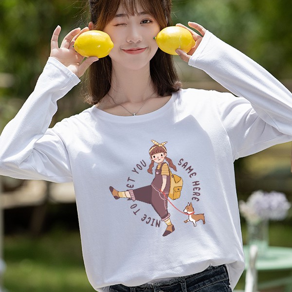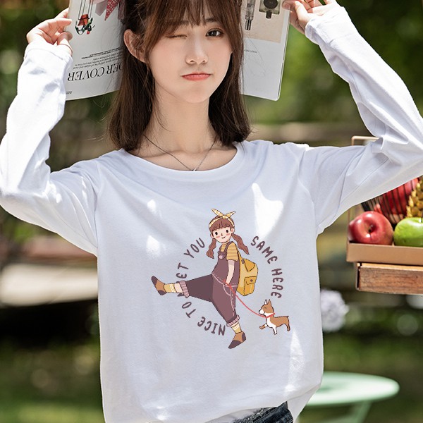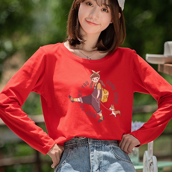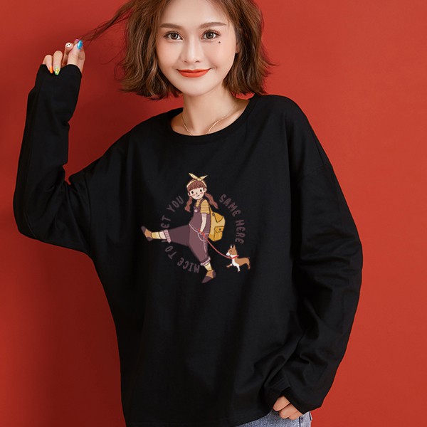 T恤 長袖T恤 【YCL754-15】長袖 女孩遛狗狗 秋冬 純棉上衣 快速出貨不用等 艾咪E舖 閨蜜裝 情侶T
