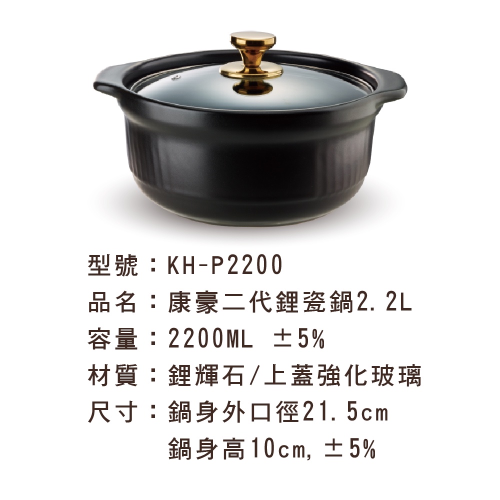 康豪 二代鋰瓷鍋附蓋 2.2L KH-P2200 通過SGS檢測