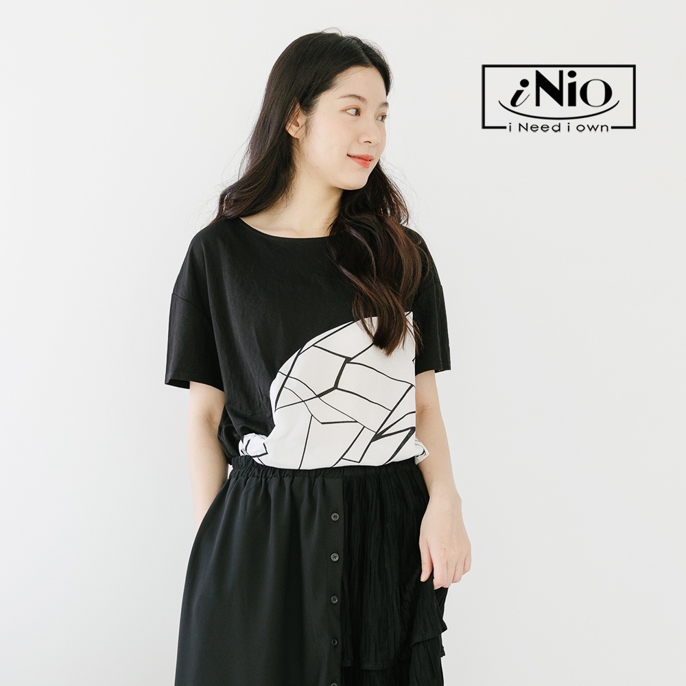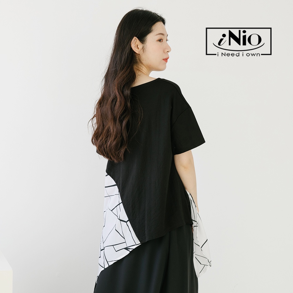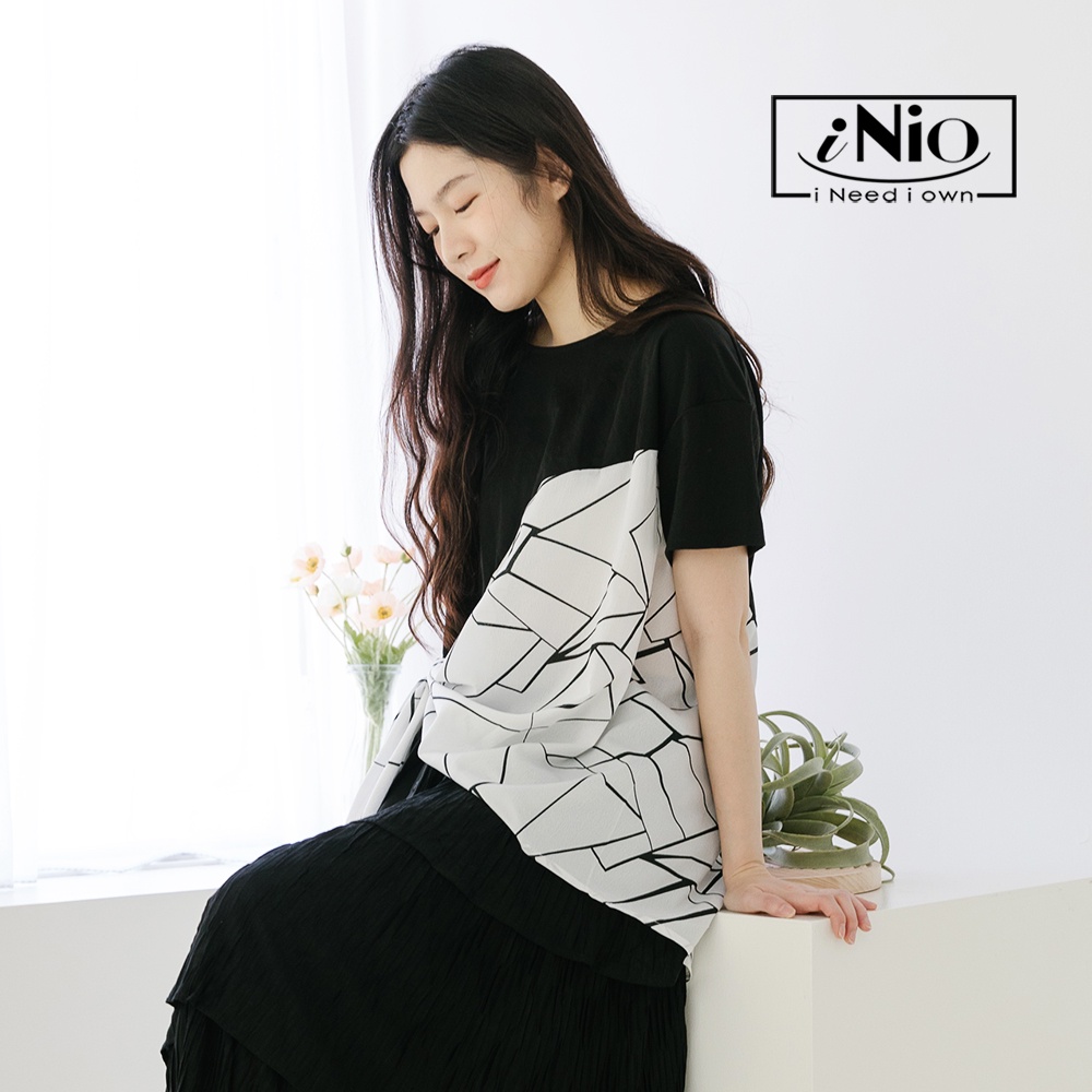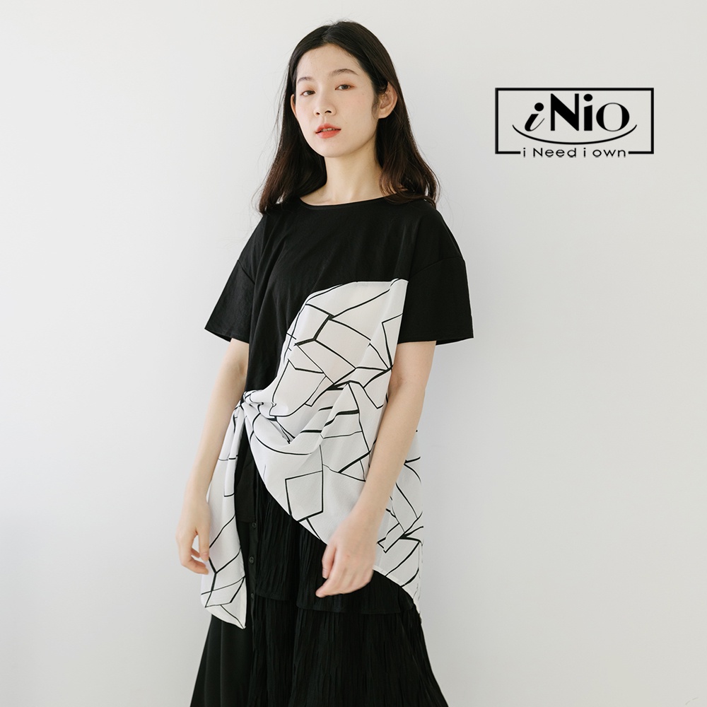 iNio 衣著美學 幾何紋 拼接 抓摺 短袖上衣-現貨快出【C2W1119】