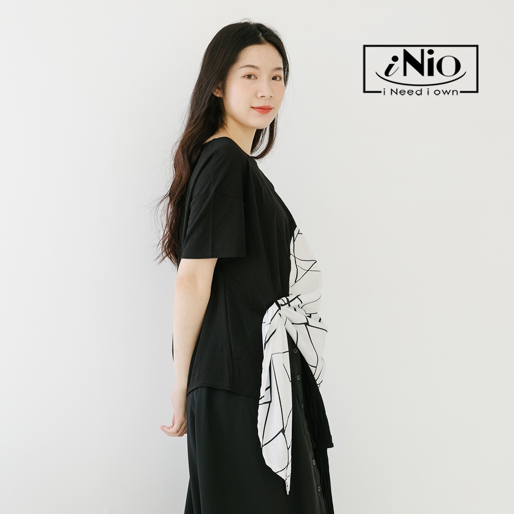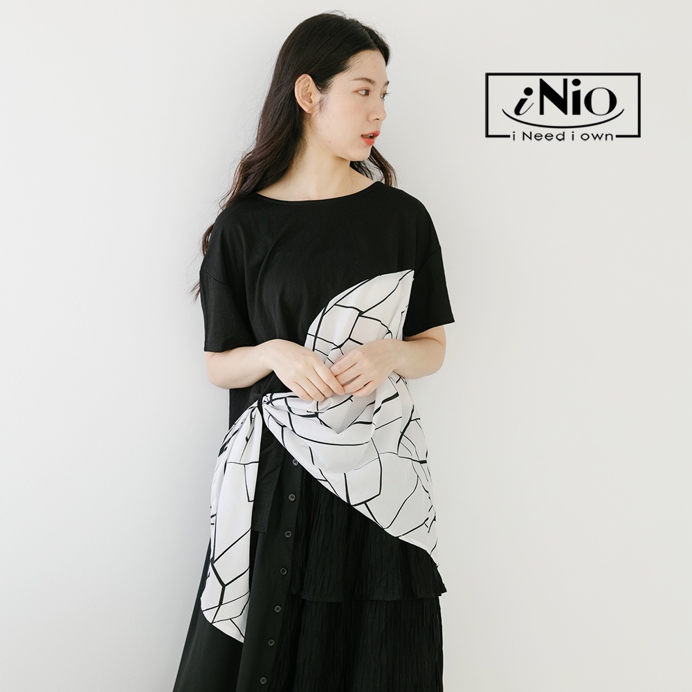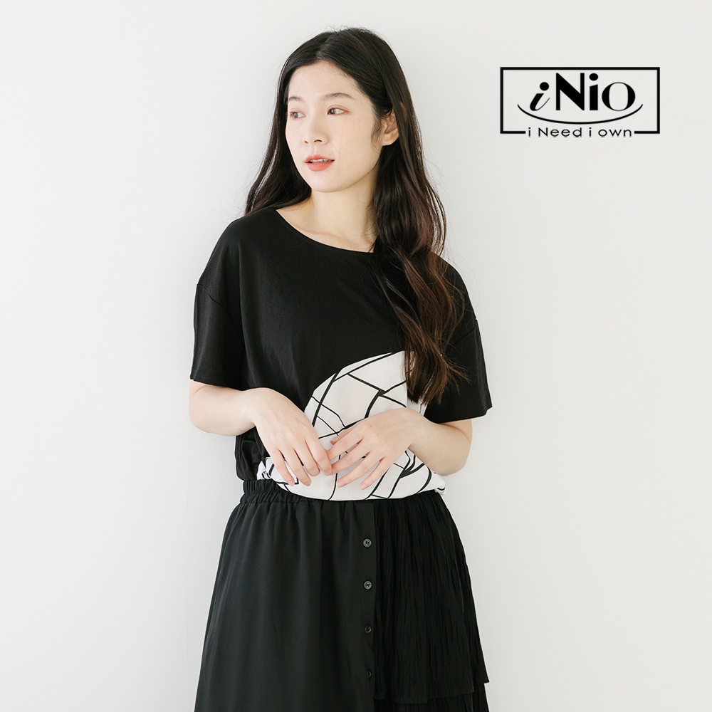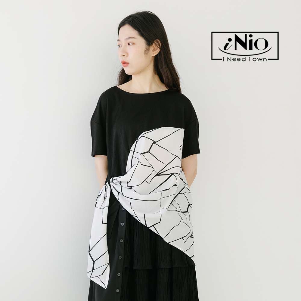 iNio 衣著美學 幾何紋 拼接 抓摺 短袖上衣-現貨快出【C2W1119】