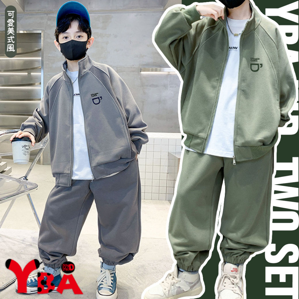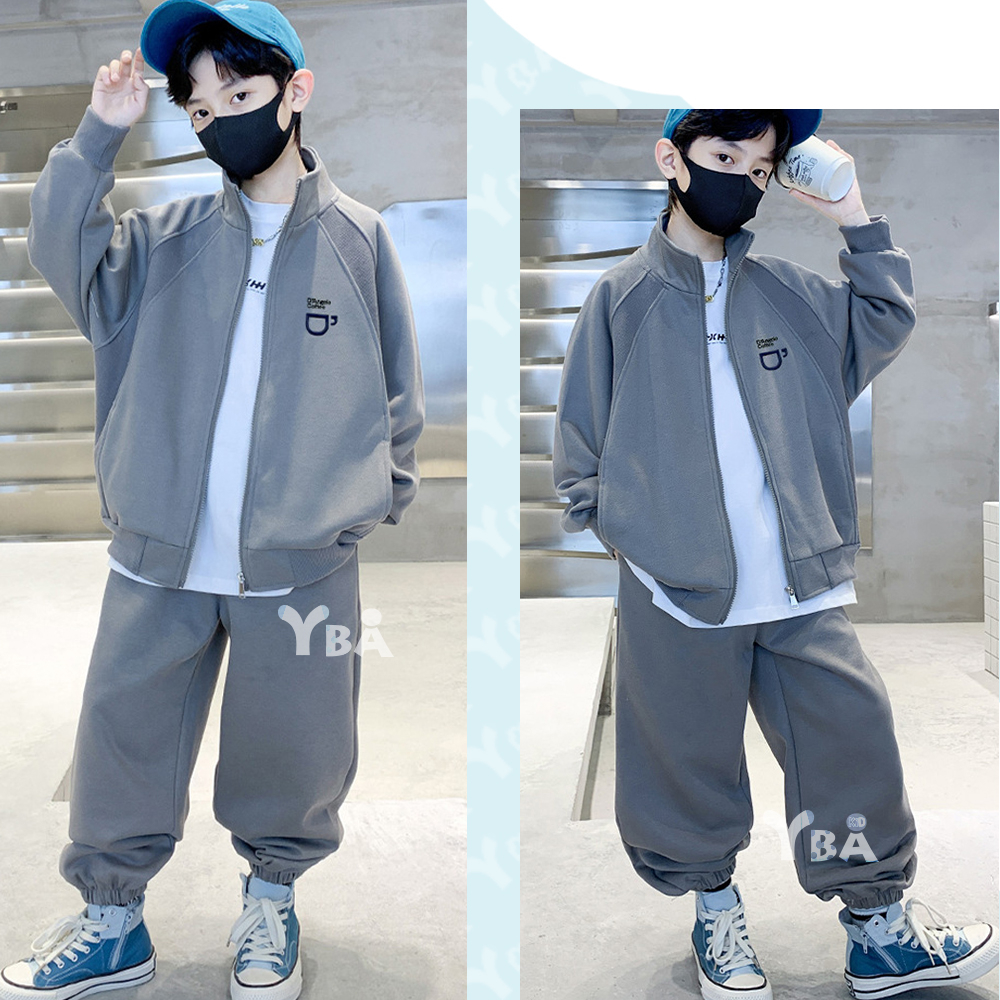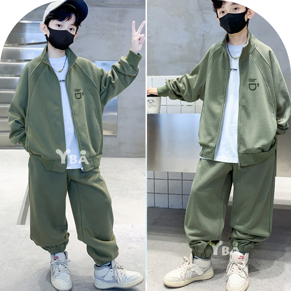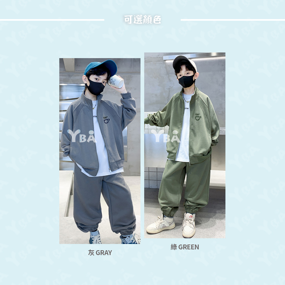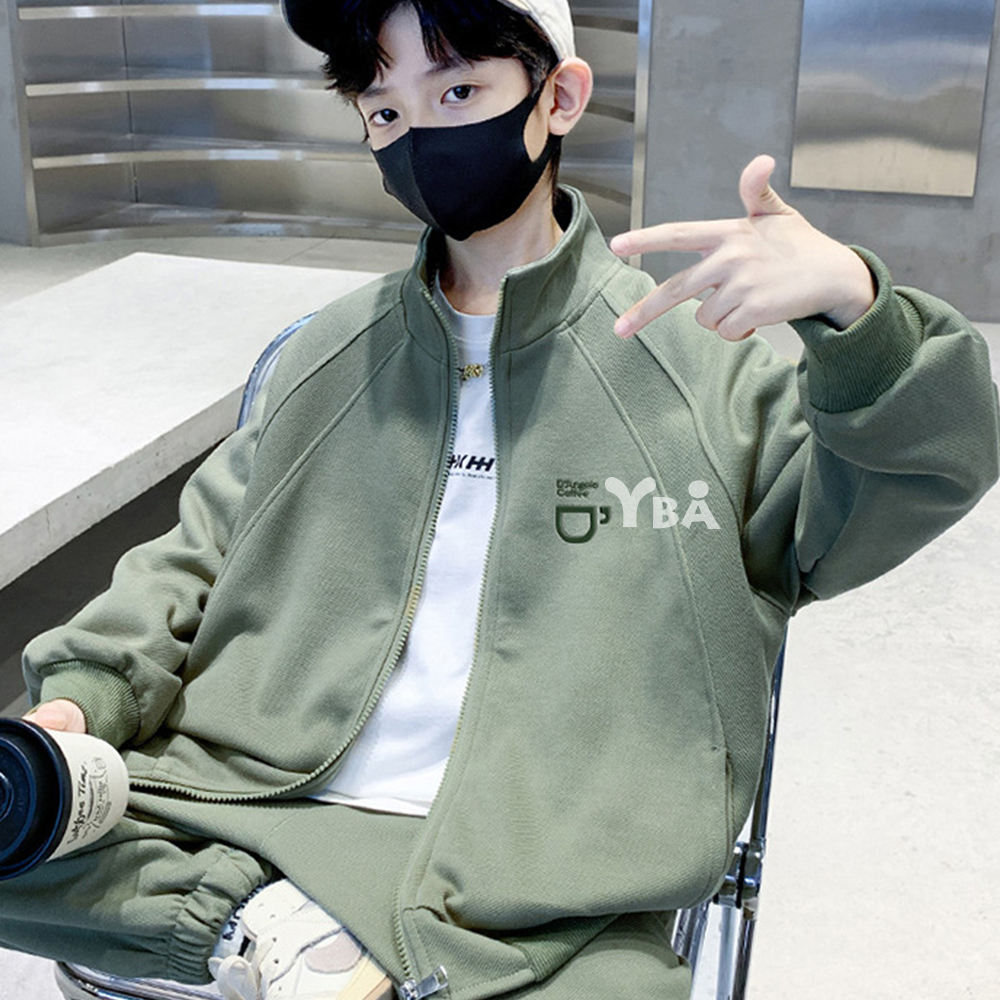 【YBA童裝】秋款插肩袖咖啡圖案素面長袖外套+美式寬褲腿鬆緊褲腳長褲09/19(灰/綠)【K43029】[預購]