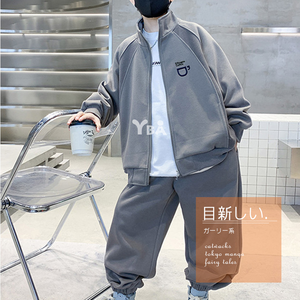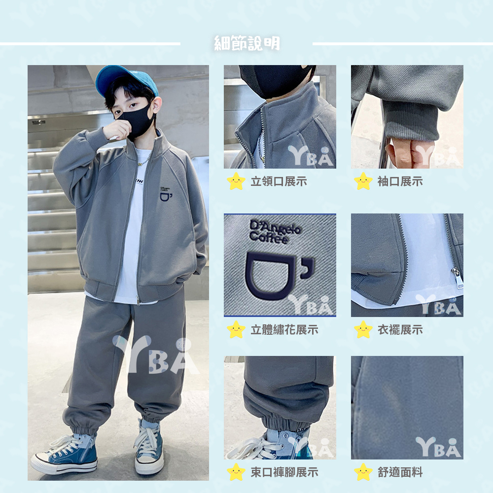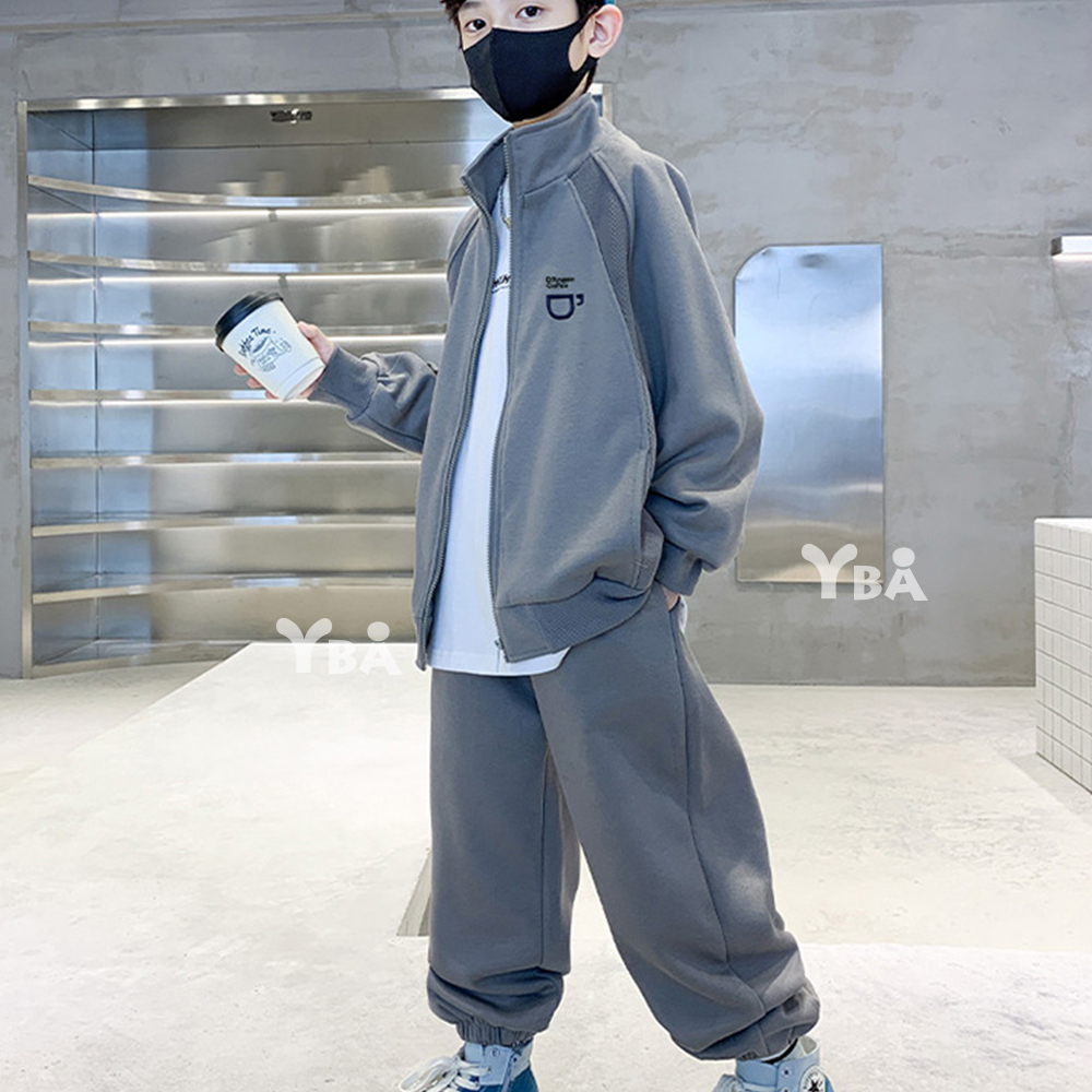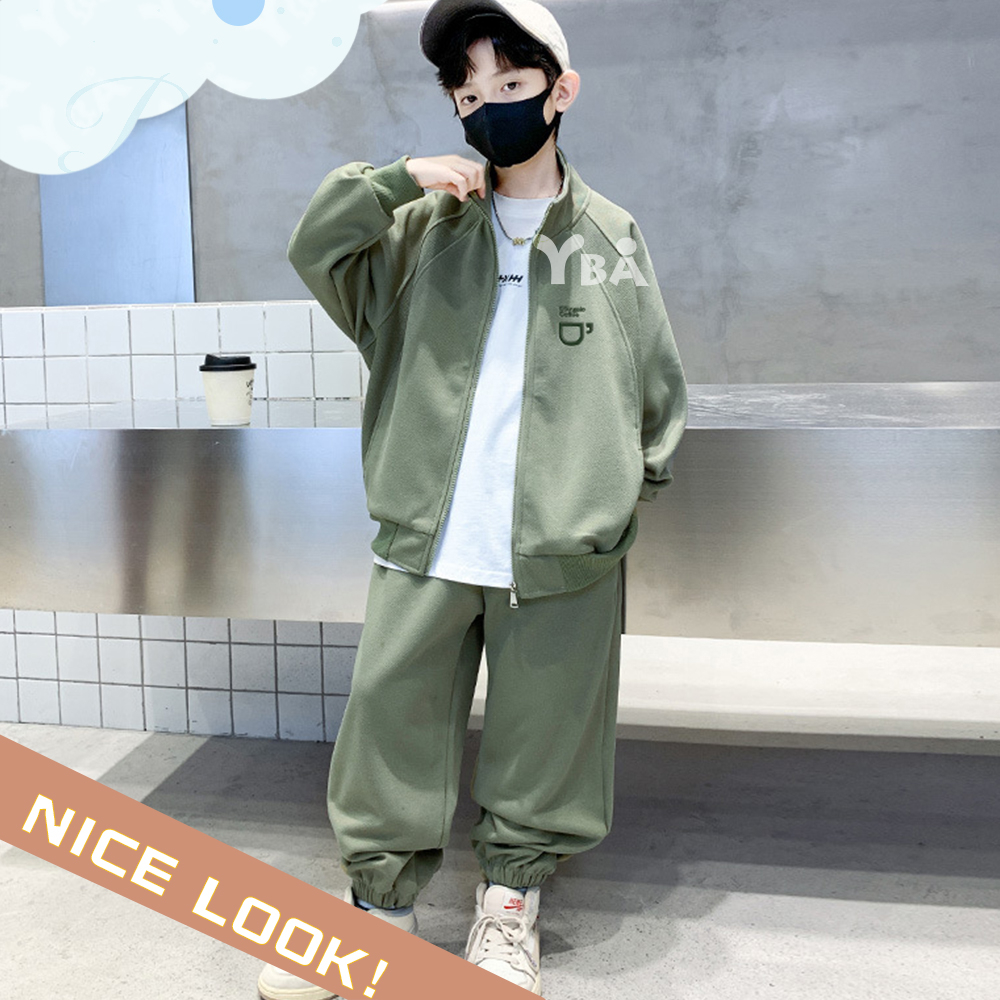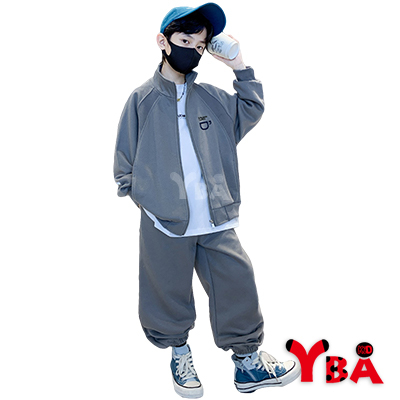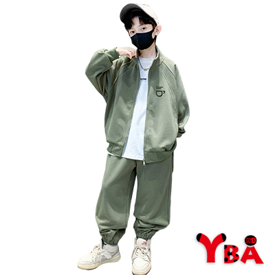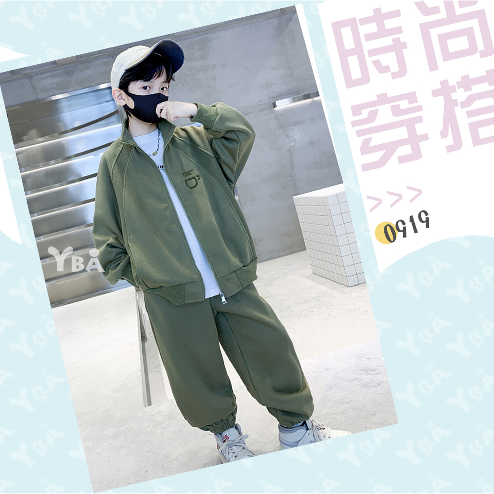 【YBA童裝】秋款插肩袖咖啡圖案素面長袖外套+美式寬褲腿鬆緊褲腳長褲09/19(灰/綠)【K43029】[預購]
