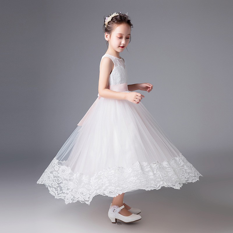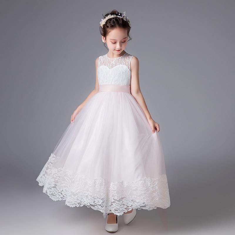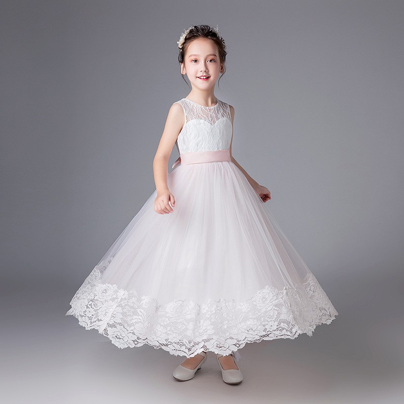 刺繡蕾絲緞帶拼接粉紗長裙澎澎裙小禮服 花童 畢業 婚禮 紗裙 女童長裙 紗裙女孩子【p0061206346426】