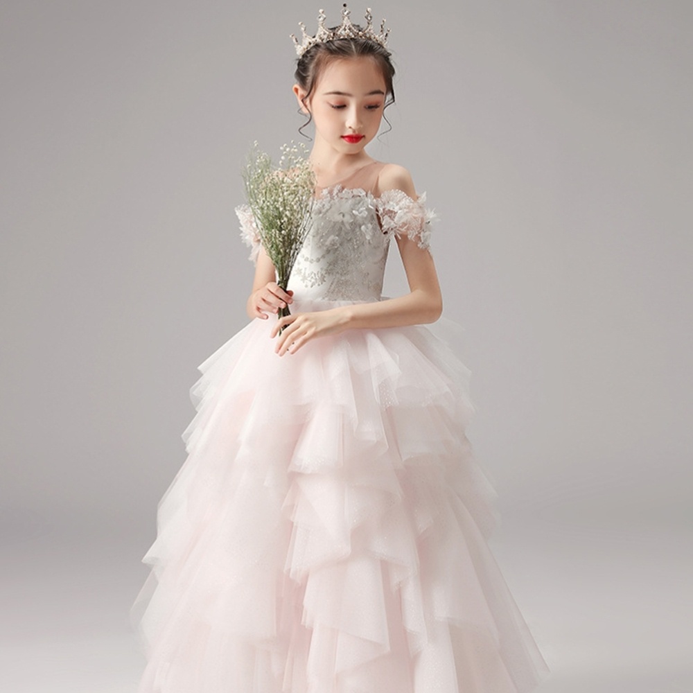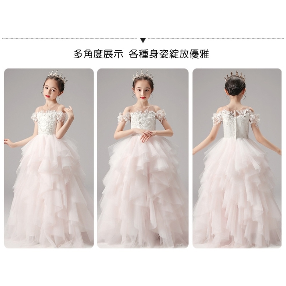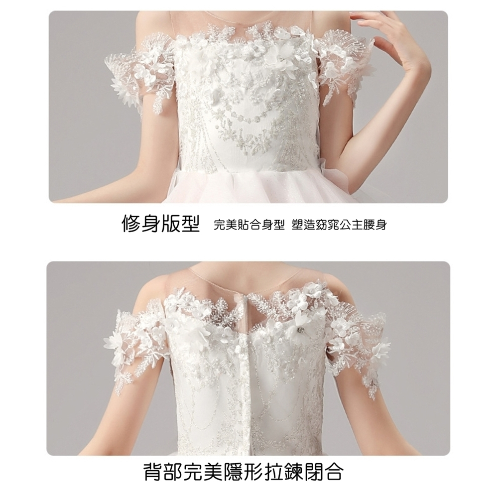 唯美亮片刺繡花朵 薄紗一字領篷篷長紗裙禮服 大童 花童 畢業 禮服 全家福 婚禮 女童【BB7523】
