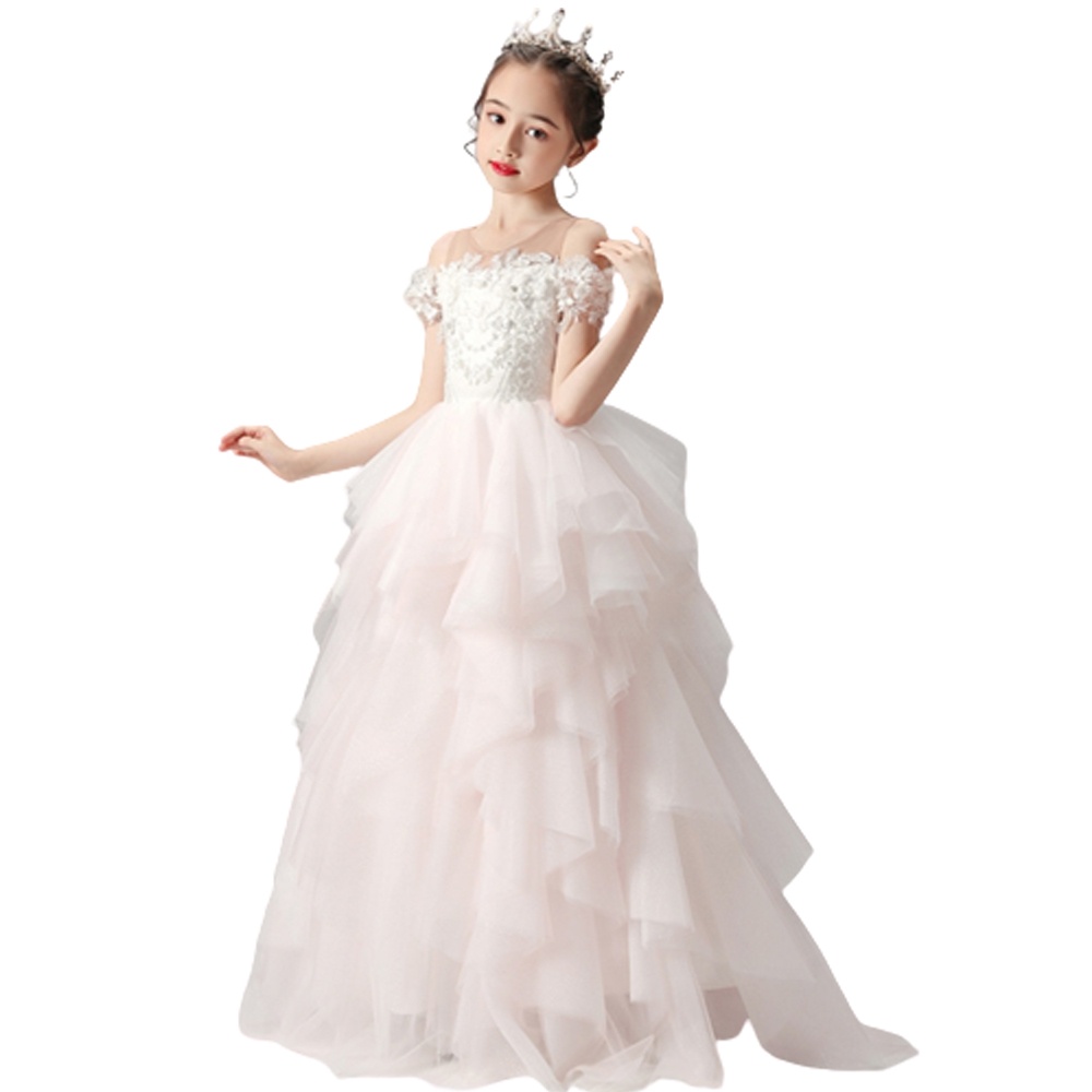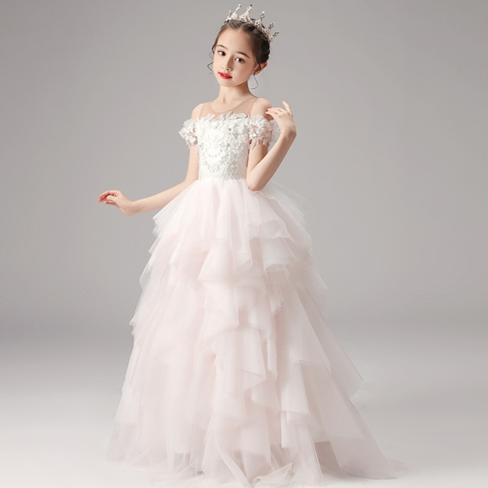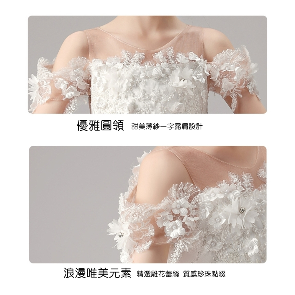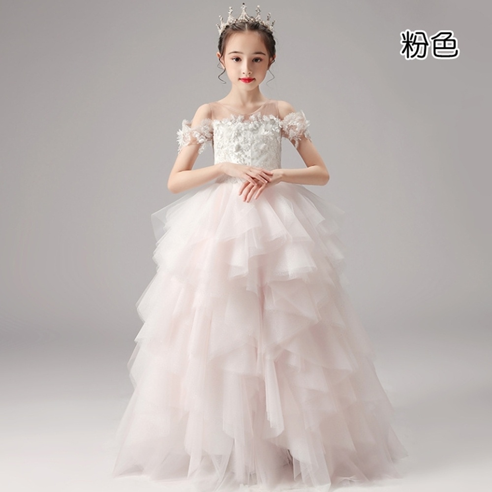 唯美亮片刺繡花朵 薄紗一字領篷篷長紗裙禮服 大童 花童 畢業 禮服 全家福 婚禮 女童【BB7523】