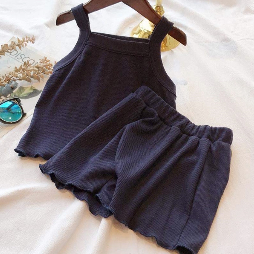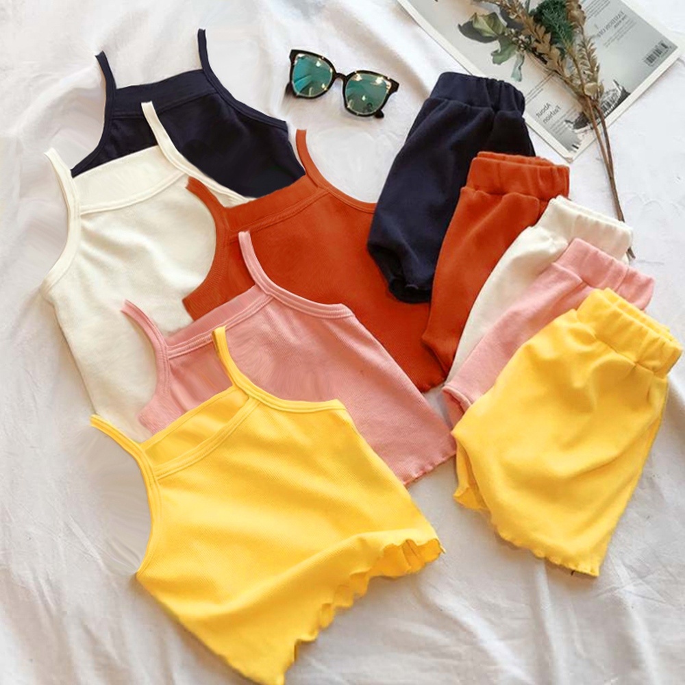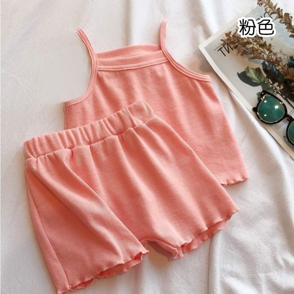 純色木耳邊螺紋肩帶背心上衣+鬆緊褲頭短褲 套裝 居家服 女童 男童 褲子 兒童【BB7719】