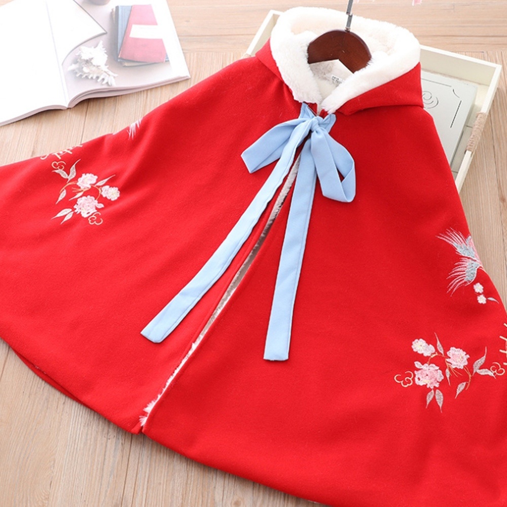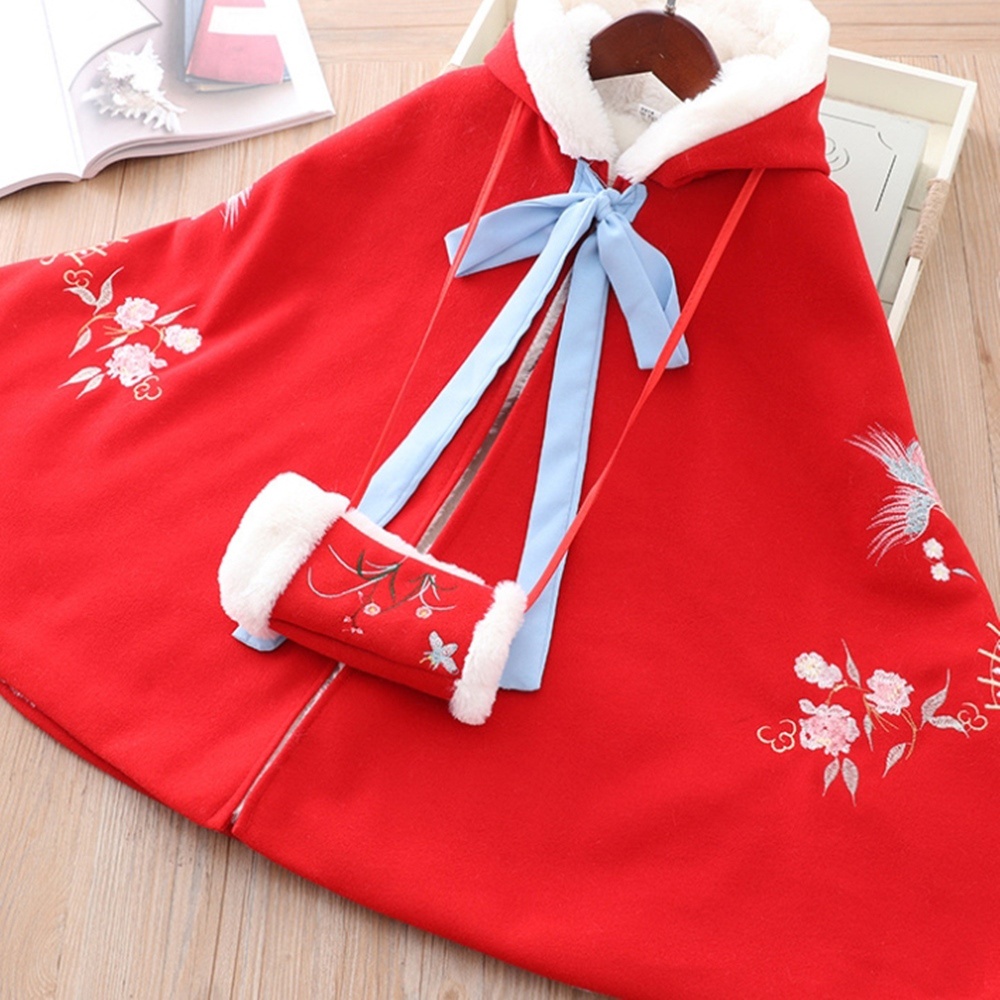 刺繡喜鵲厚毛絨綁帶連帽斗篷+暖手套 披肩 外套 女童 大童 大紅 新年 過年 拜年服【p0061232533712】