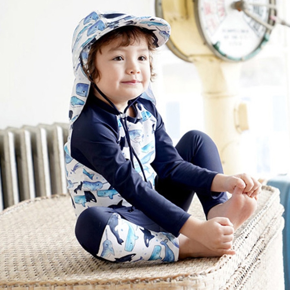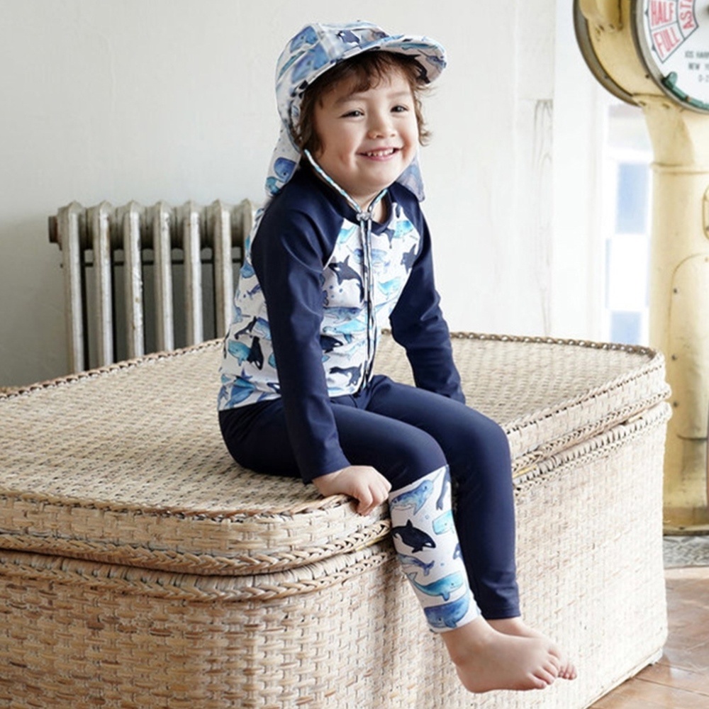 鯨魚滿印插肩長袖泳裝 套裝 3件式 水母褲 水母衣 防曬泳衣 玩水 男童 兒童 大童 童裝 橘魔法 現貨【BB8572】