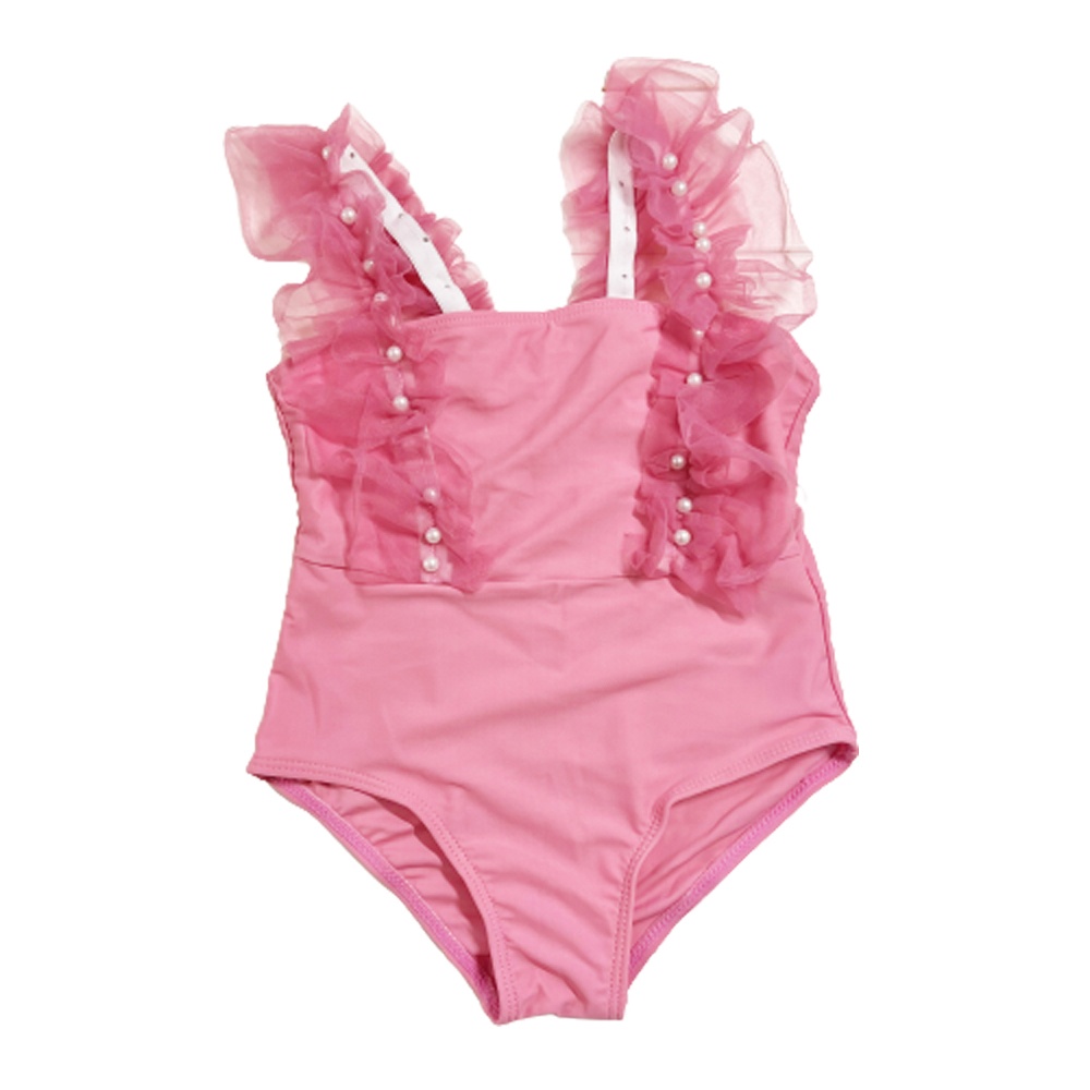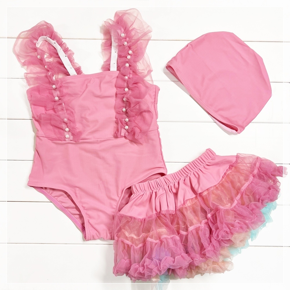 珍珠紗質荷葉袖露背連身泳裝+蛋糕澎澎裙 附泳帽 2件式 泳衣 玩水 女童 兒童 童裝【BB8119】