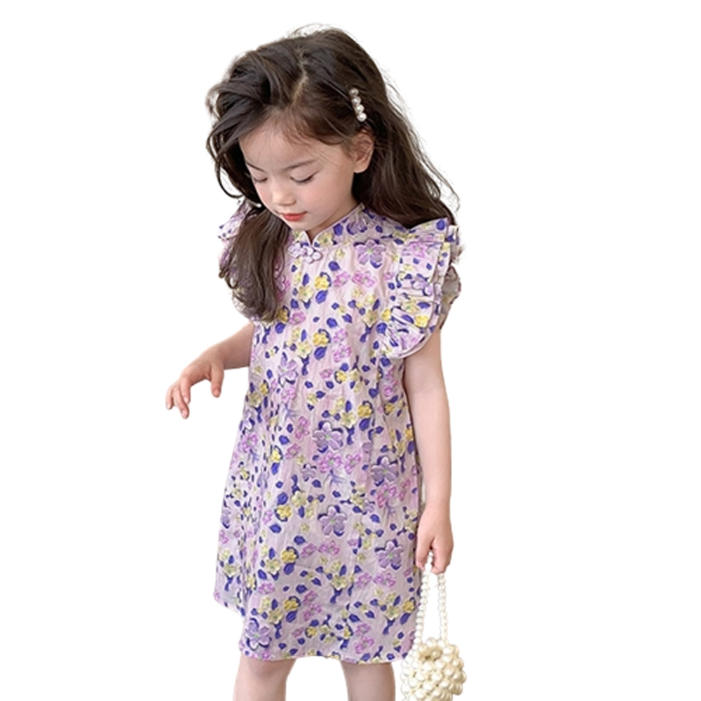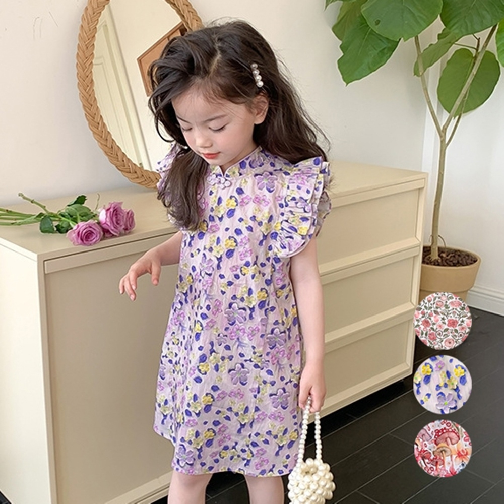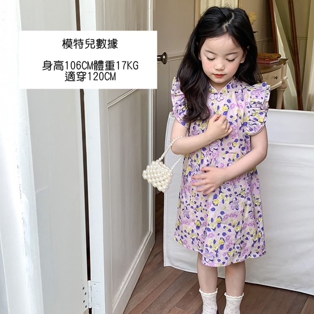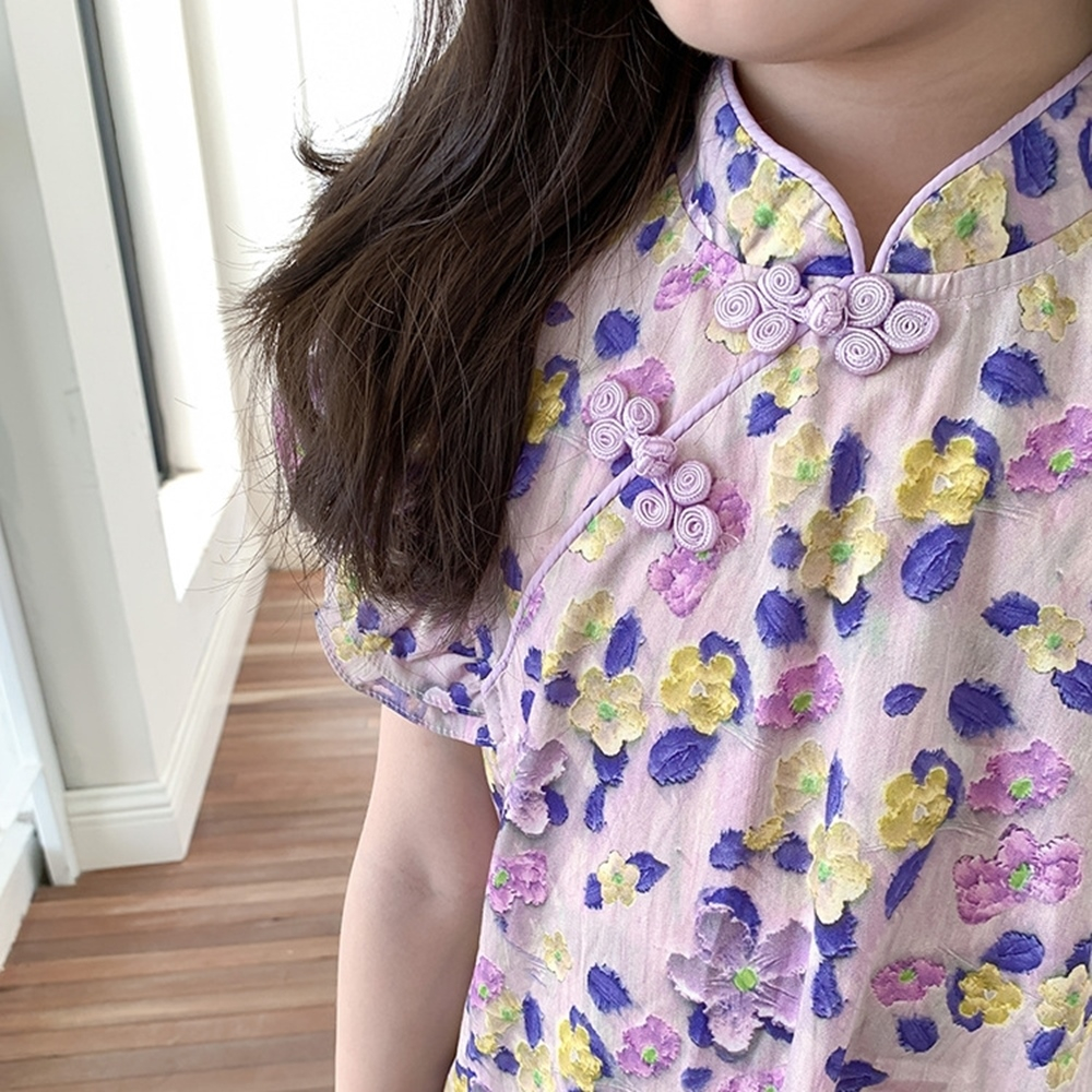 花花滾邊盤扣小包袖旗袍洋裝 旗袍 中國風 女童 連身裙 中童 現貨 兒童 童裝【p0061259910816】