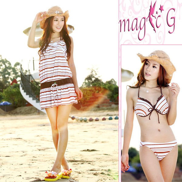 咖啡條紋平口3件式鋼圈繞頸比基尼 泳衣+洋裝泳裝 顯瘦 泳裝 橘魔法 現貨在台灣【p0061155983862】