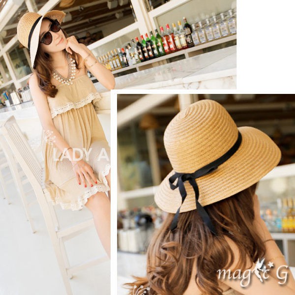 海灘度假 小圓頂蝴蝶結緞帶草帽 比基尼 泳衣 遮陽帽 防曬帽 橘魔法 現貨在台灣【p0061167144576】