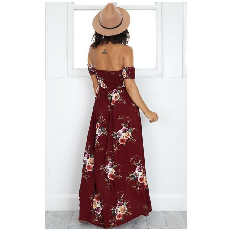 彩色玫瑰一字領開岔雪紡沙灘裙 長裙 裙子 連身裙 洋裝 比基尼 搭配必備 海邊 夏天 橘魔法【BB8814】