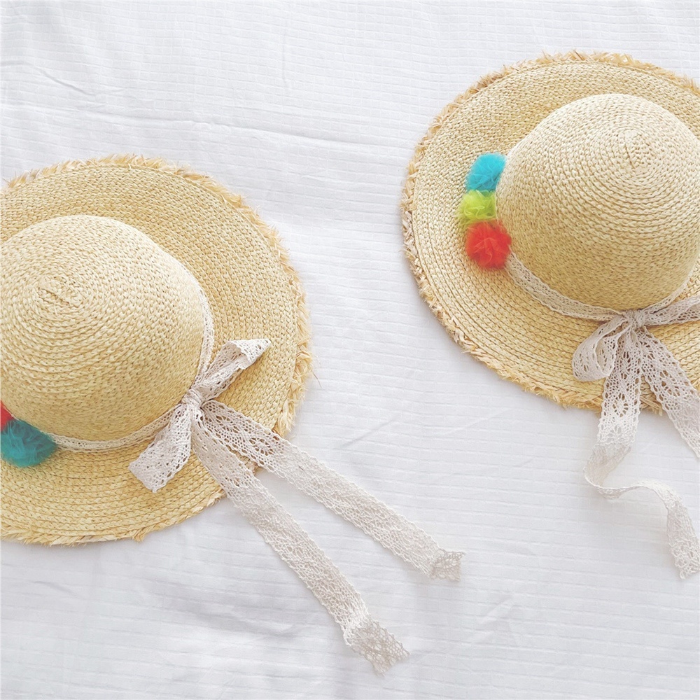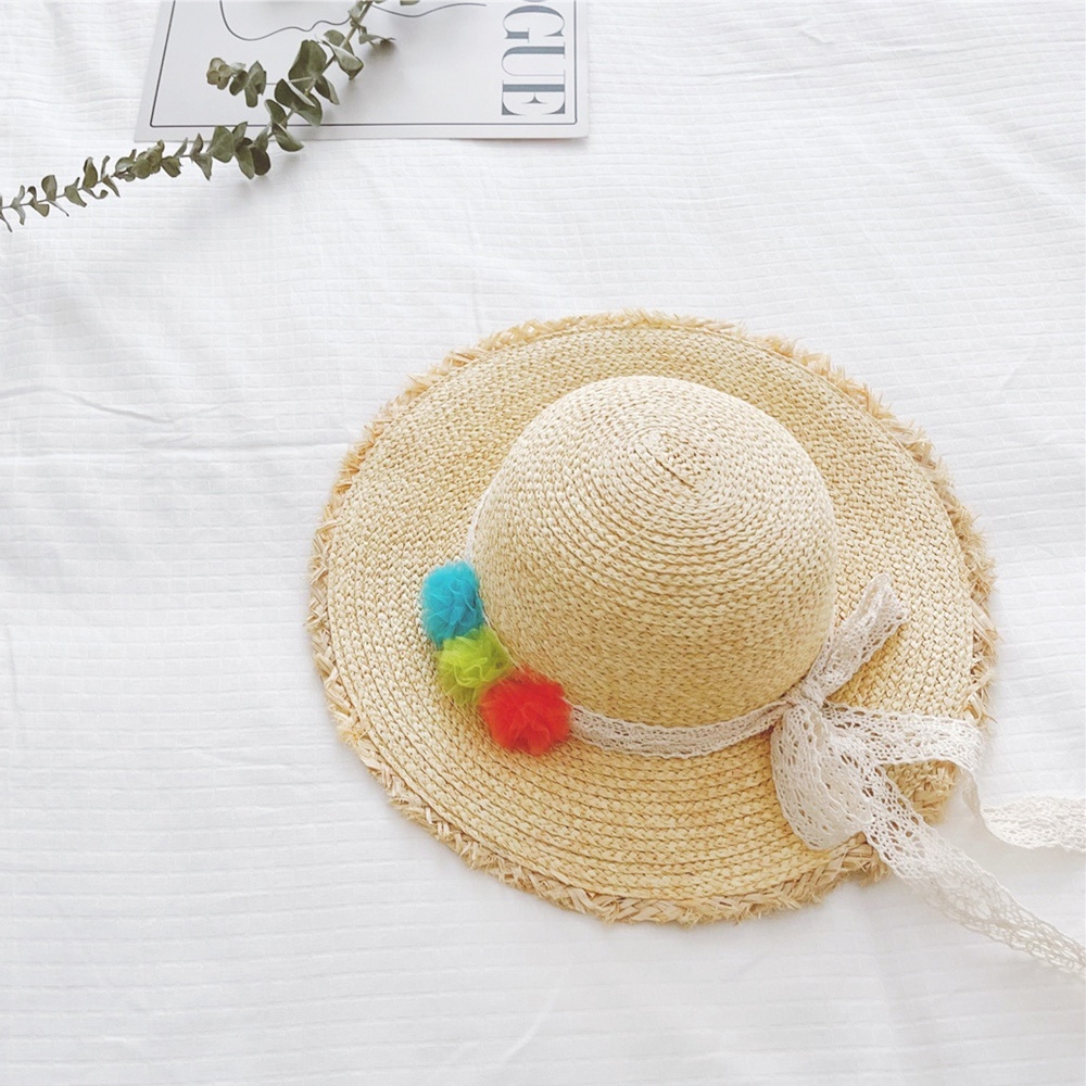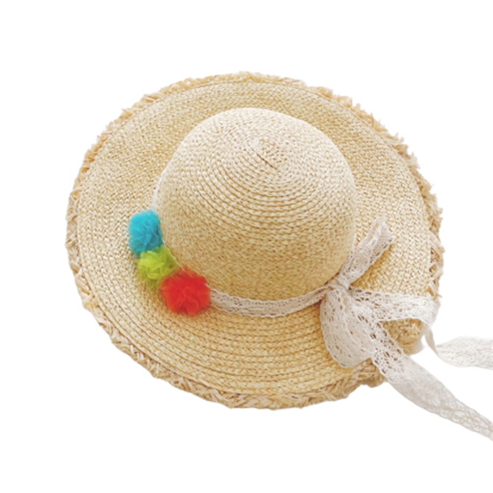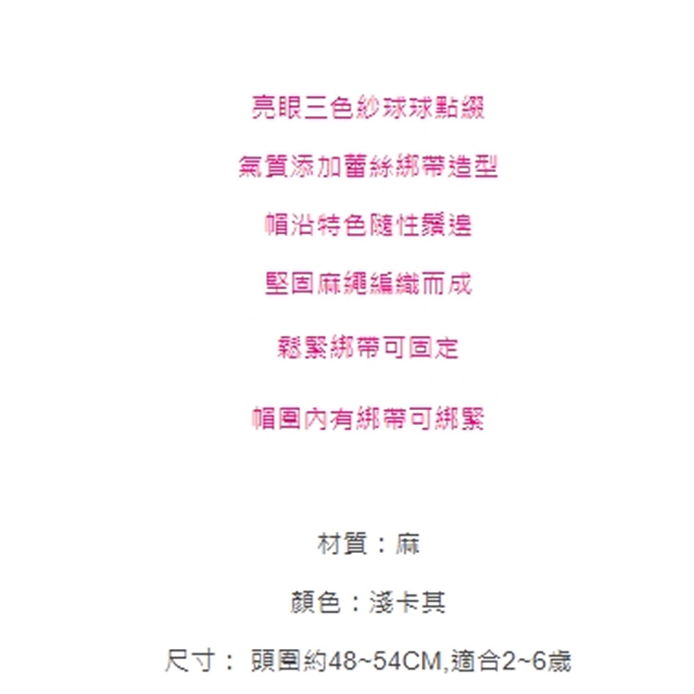 三色紗球蕾絲綁帶鬚邊草帽 帽子 大帽沿 草帽 麻帽 遮陽帽 防曬帽 童帽 女童 兒童【p0061235384910】