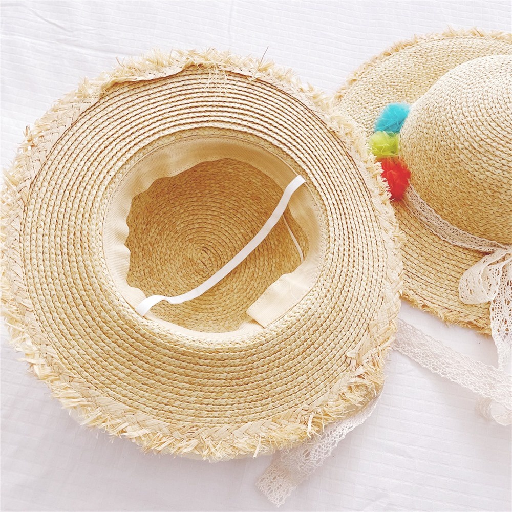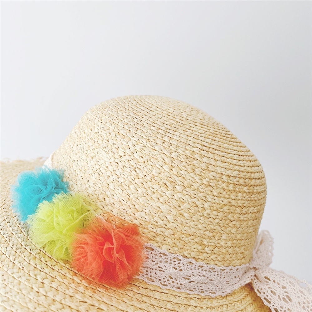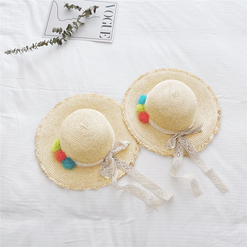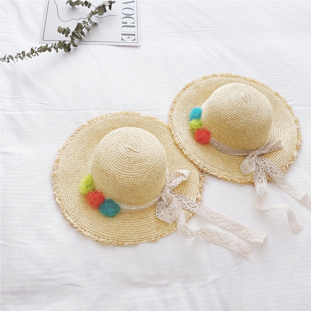 三色紗球蕾絲綁帶鬚邊草帽 帽子 大帽沿 草帽 麻帽 遮陽帽 防曬帽 童帽 女童 兒童【p0061235384910】