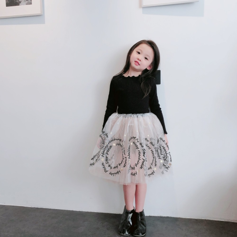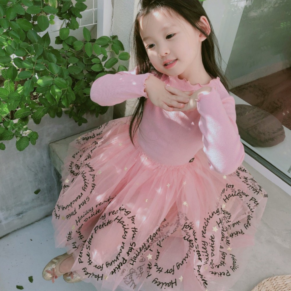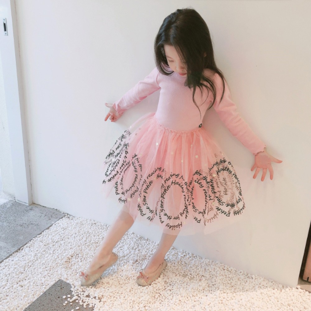 木耳邊螺紋拼接字母蕾絲紗裙洋裝 連衣裙 長袖洋裝 連身裙 連身洋裝 紗裙 女童 橘魔法【BB7701】