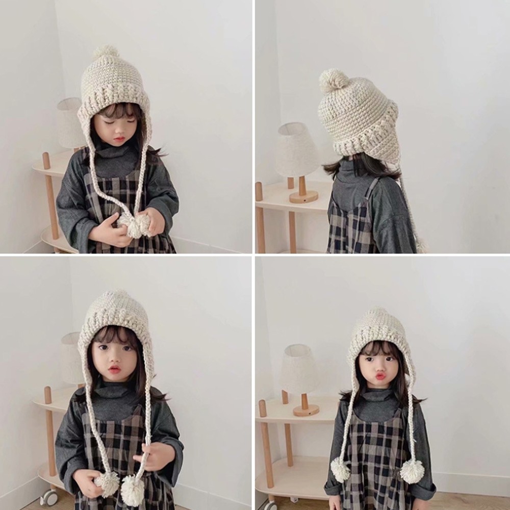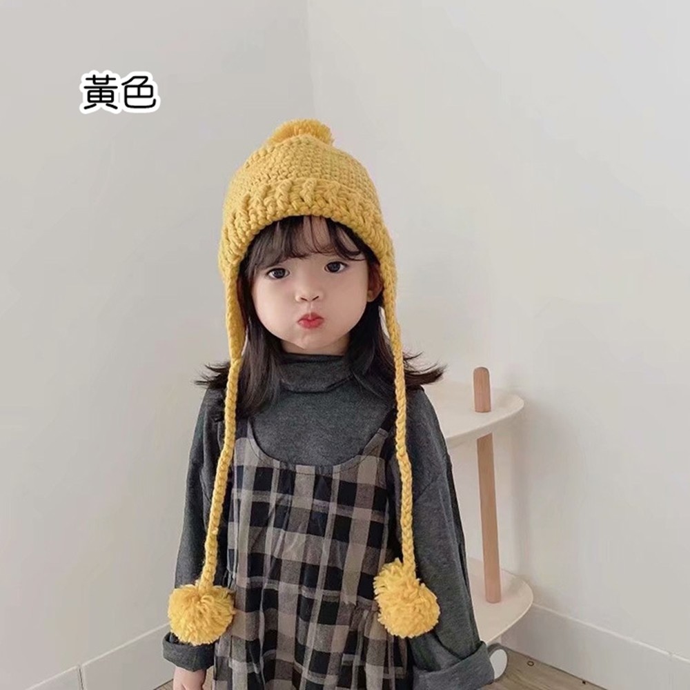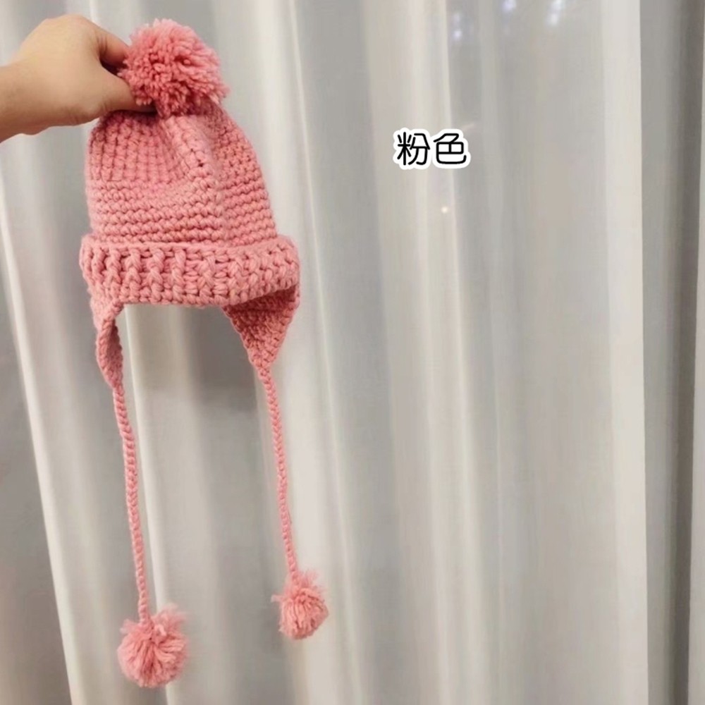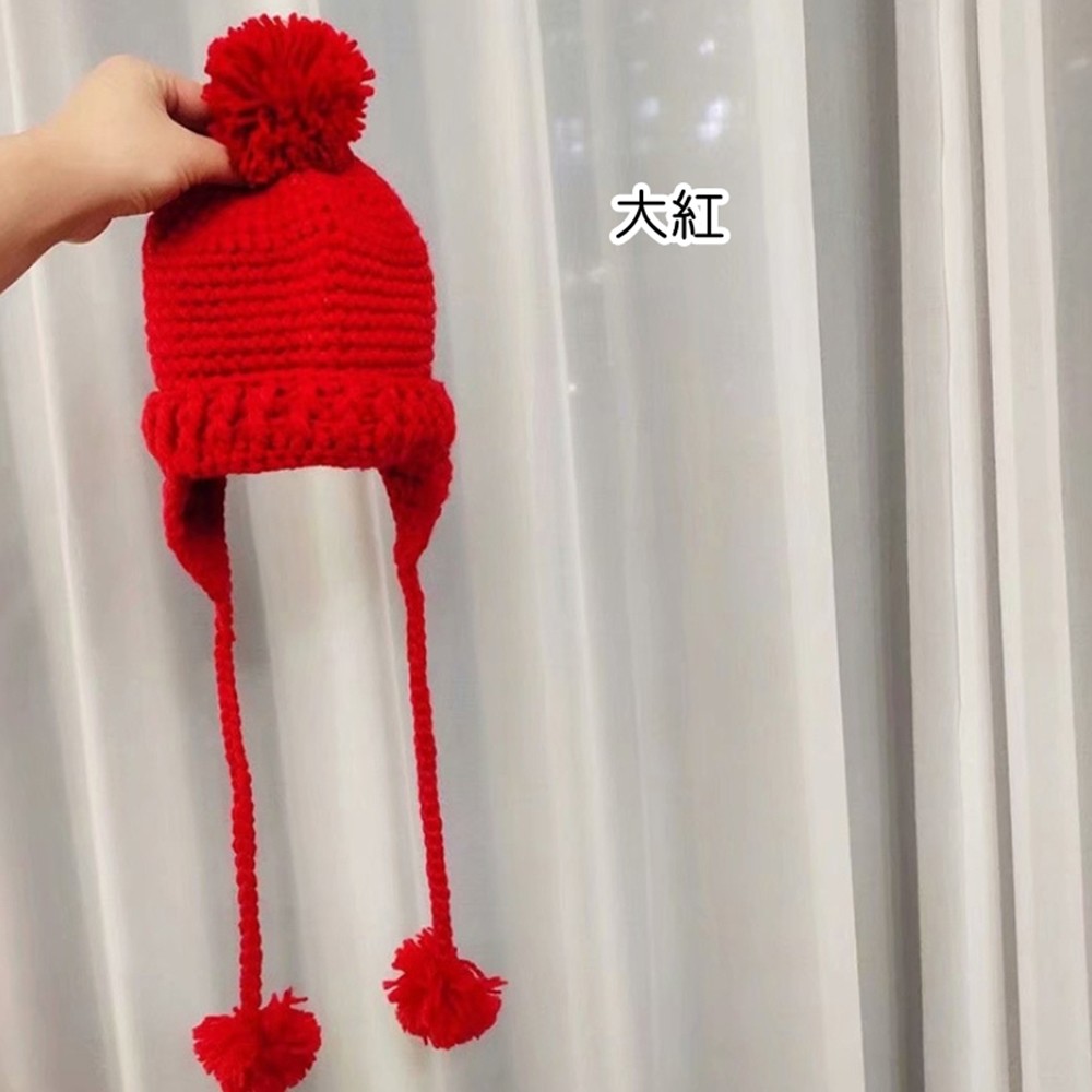 厚款粗針織毛球辮子毛帽 防風繩 帽子 針織帽 護耳帽 寒流 保暖 男童 女童 大紅 橘魔法 現貨【BB7535】